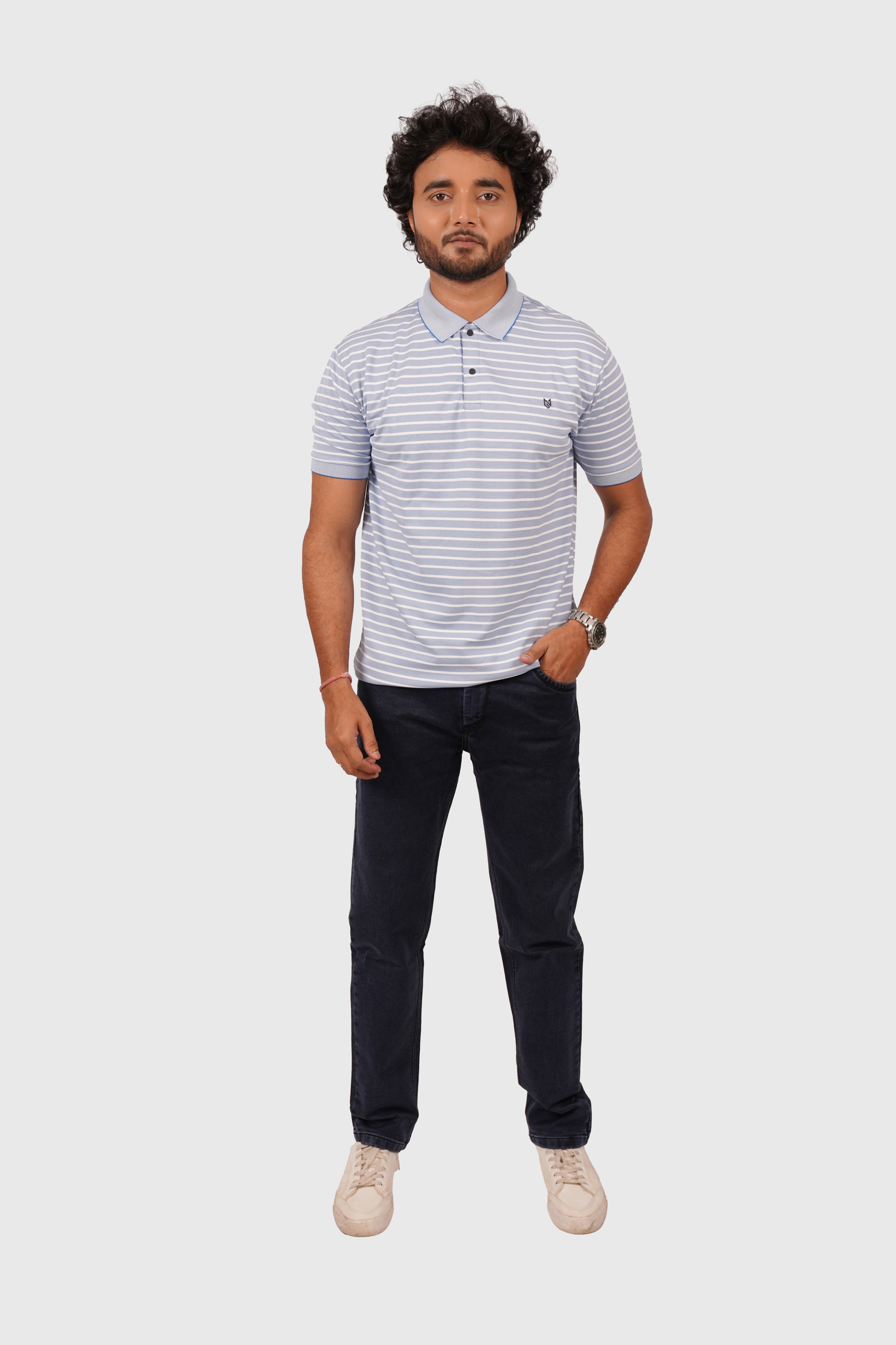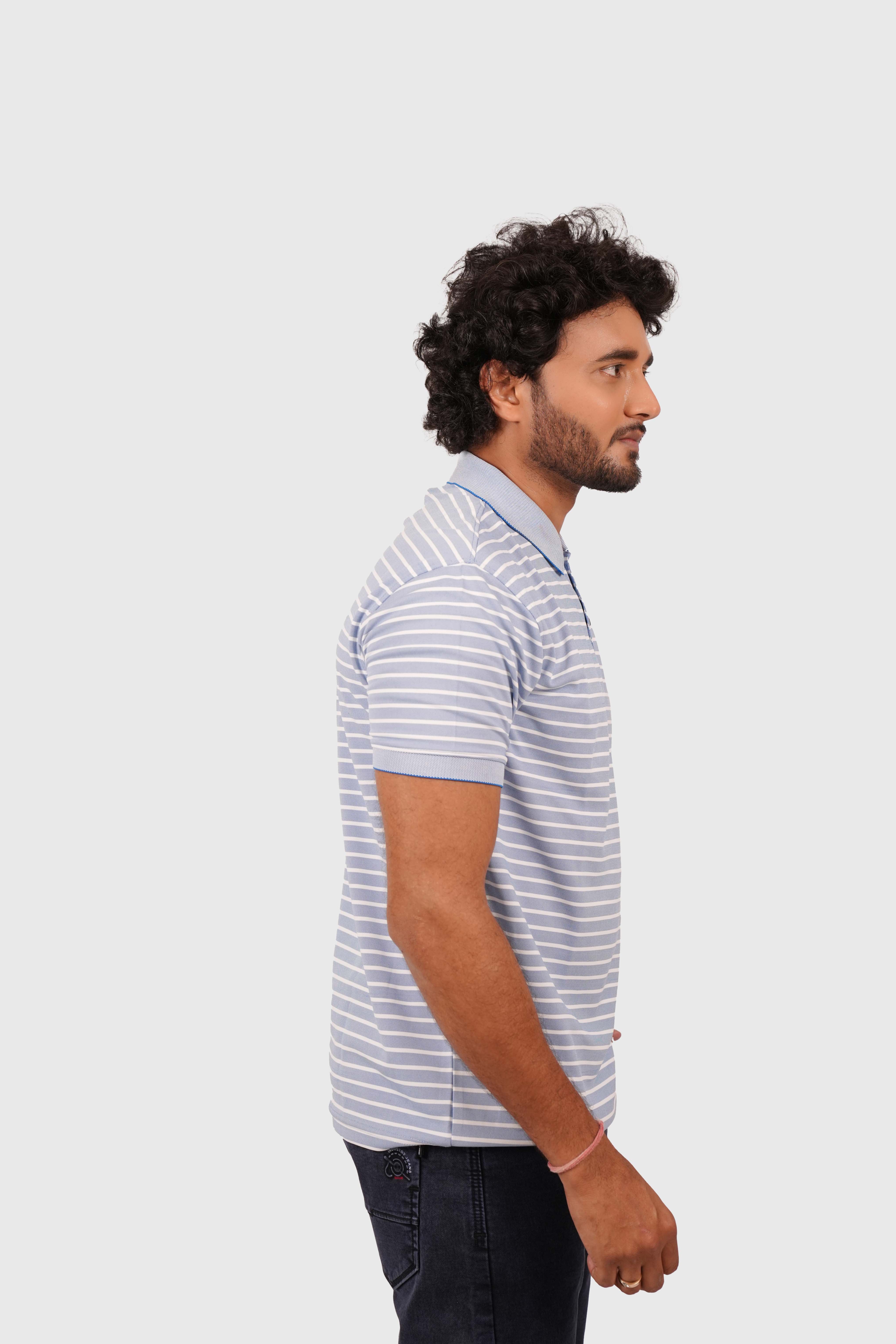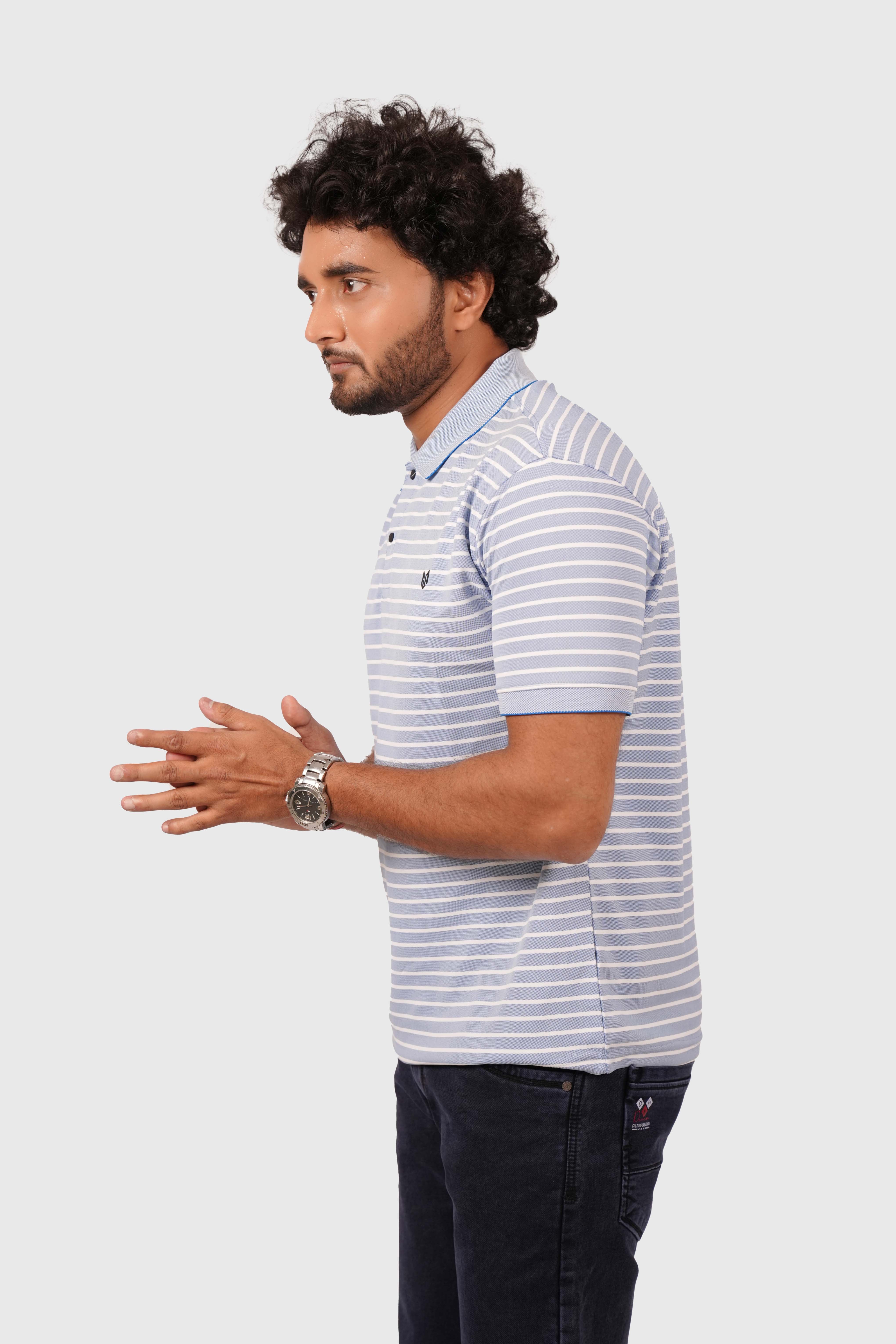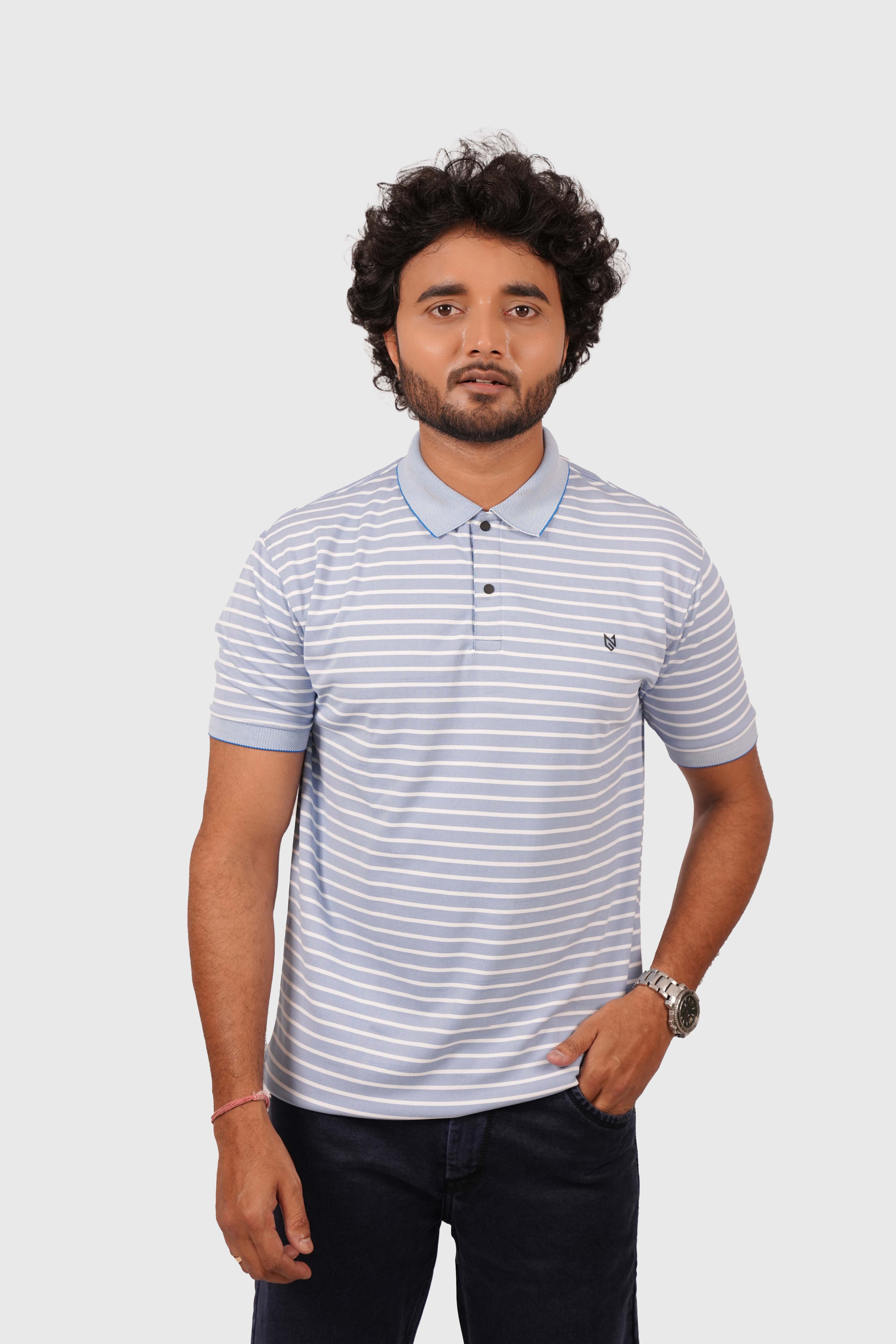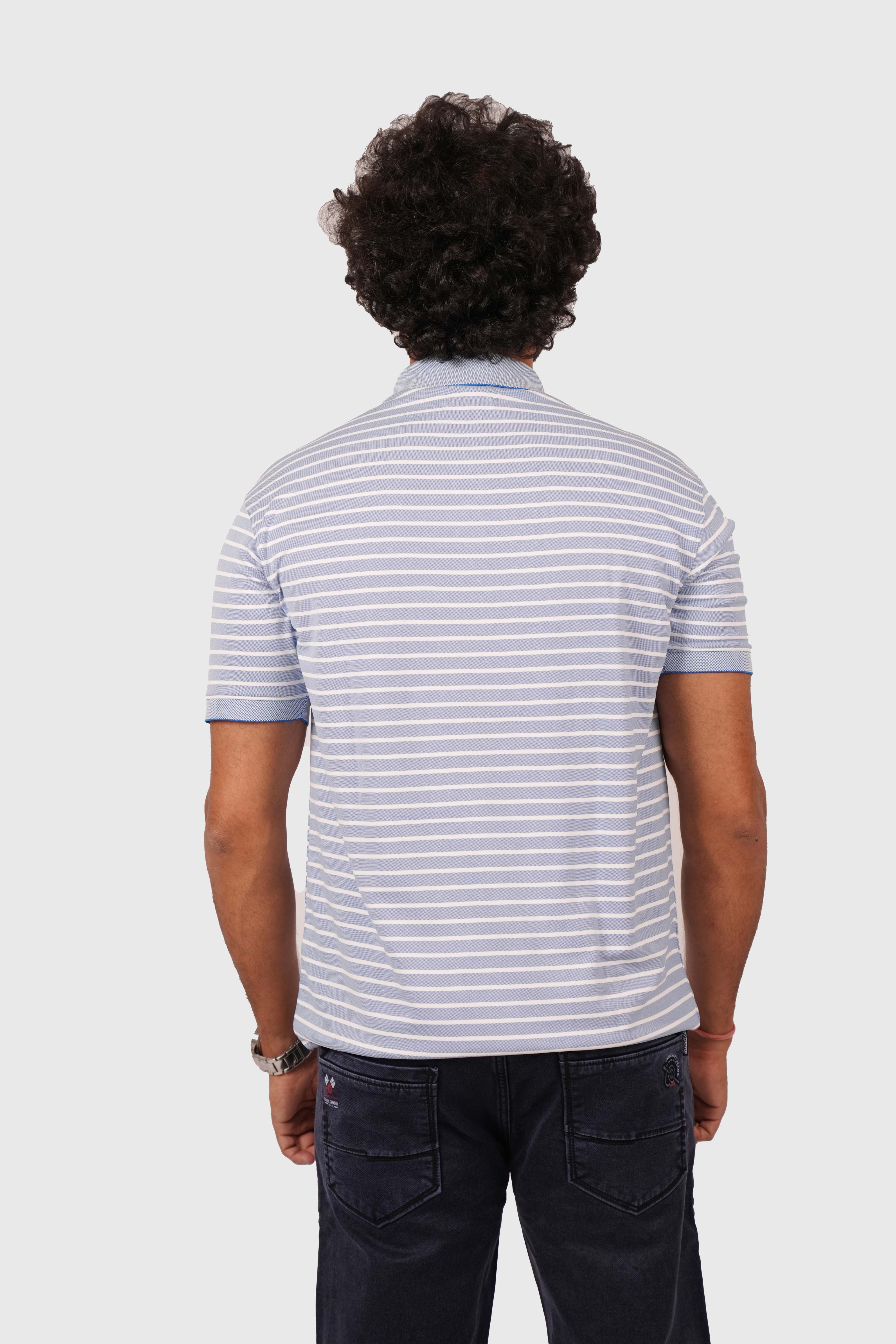 Light blue striped polo T-shirt in SmartTech Dri-Fit fabric with breathable comfort, stretch fit, and sporty elegance.