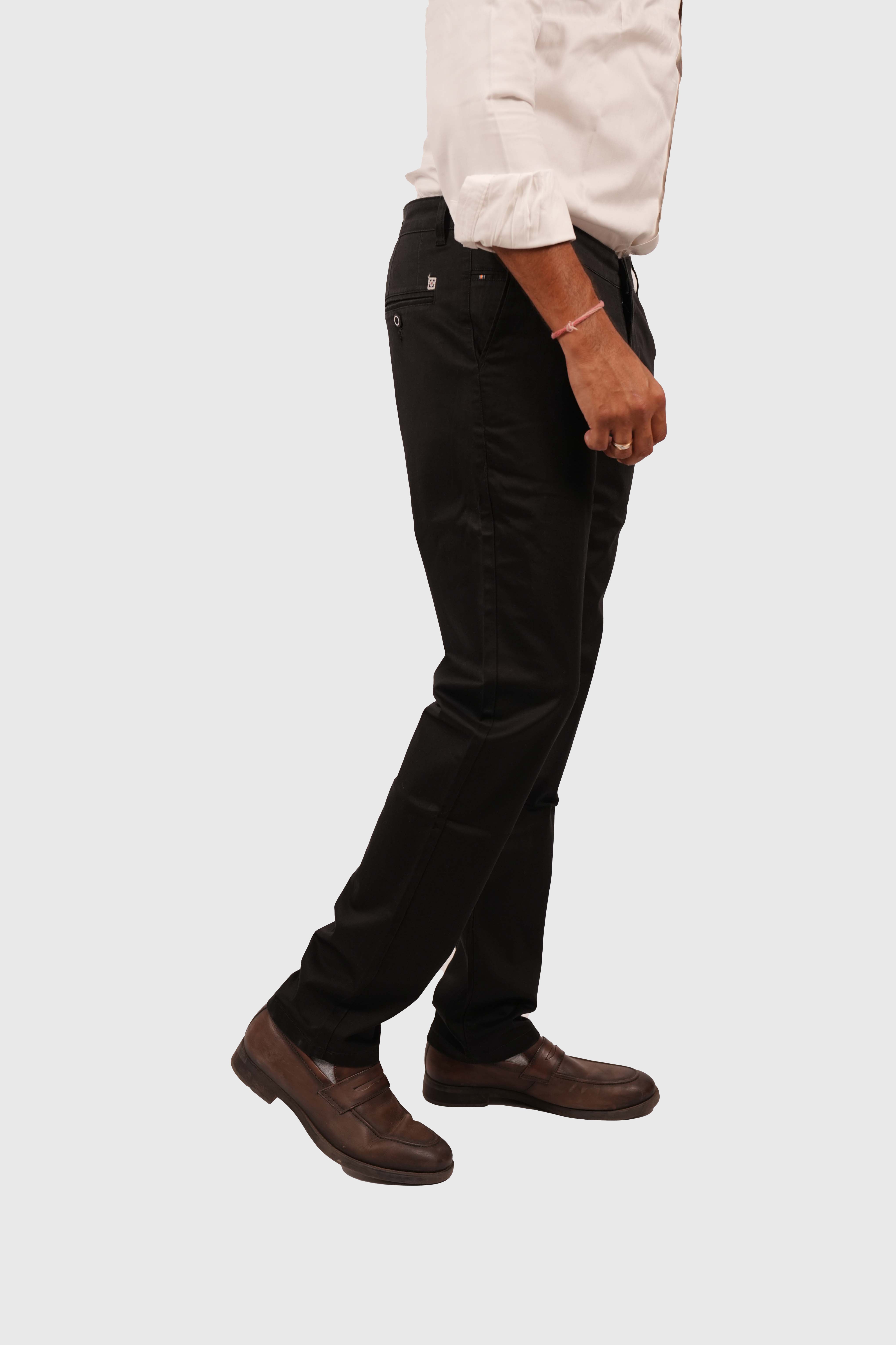 Black cotton regular-fit pants with a tailored silhouette for timeless, everyday smart style.