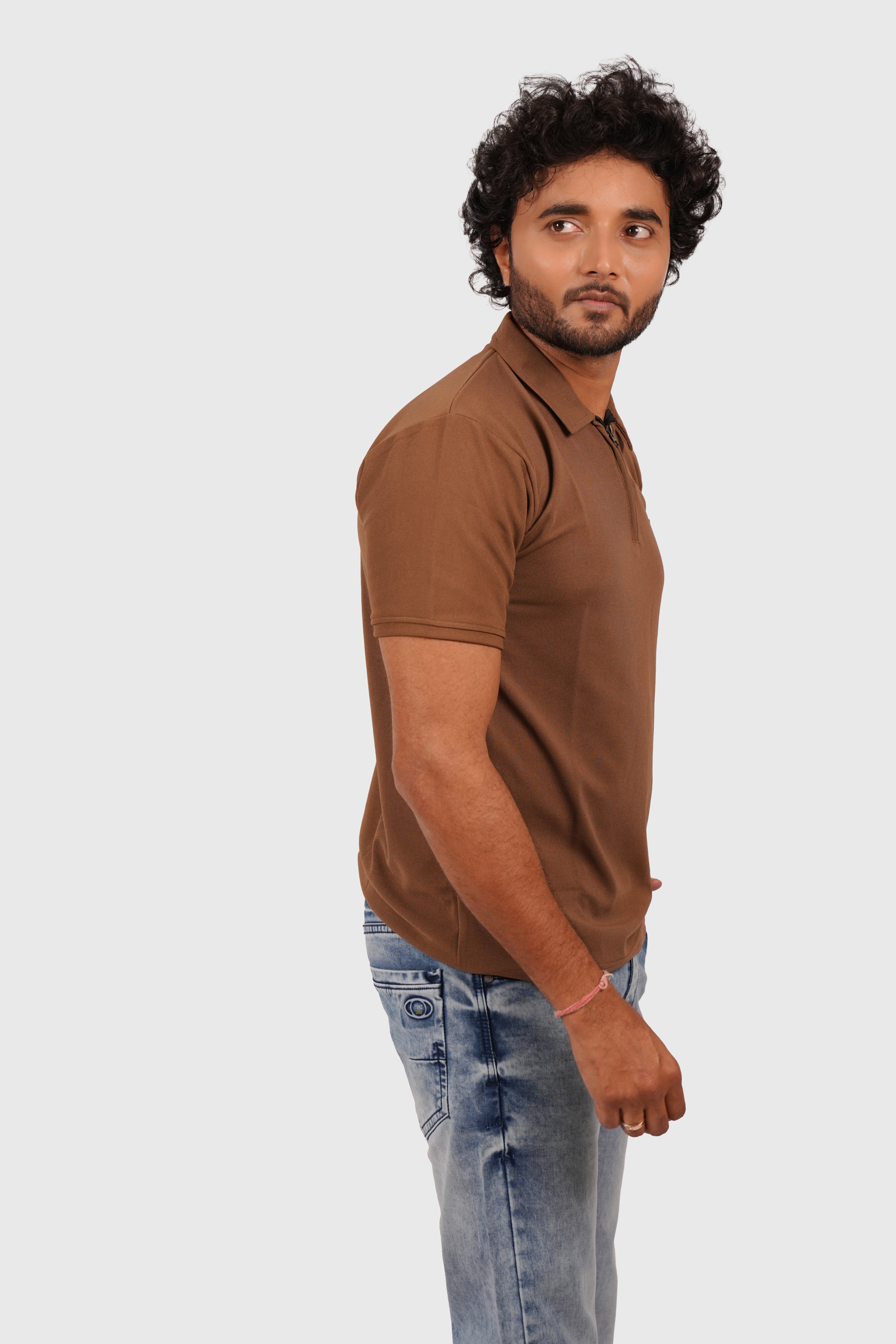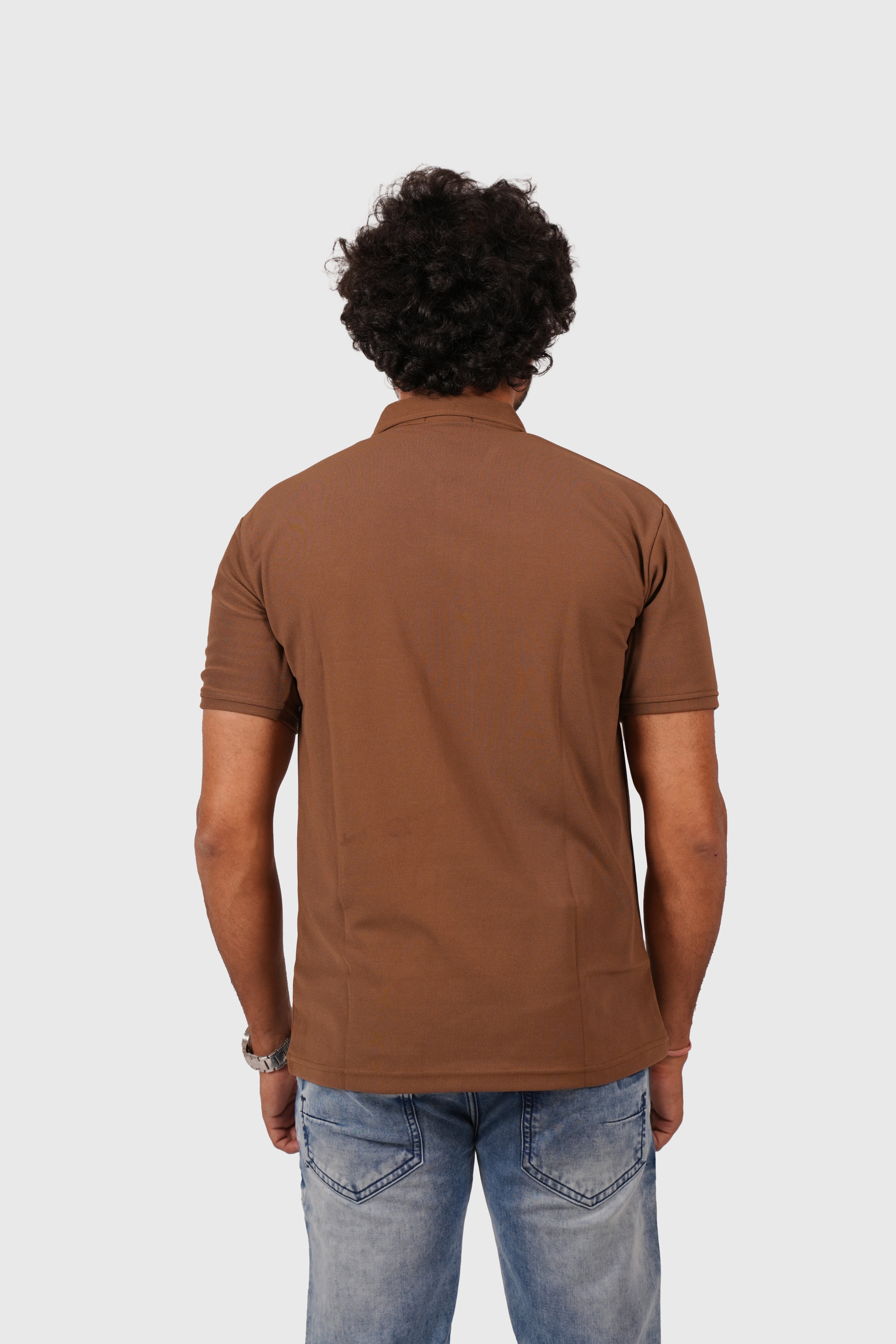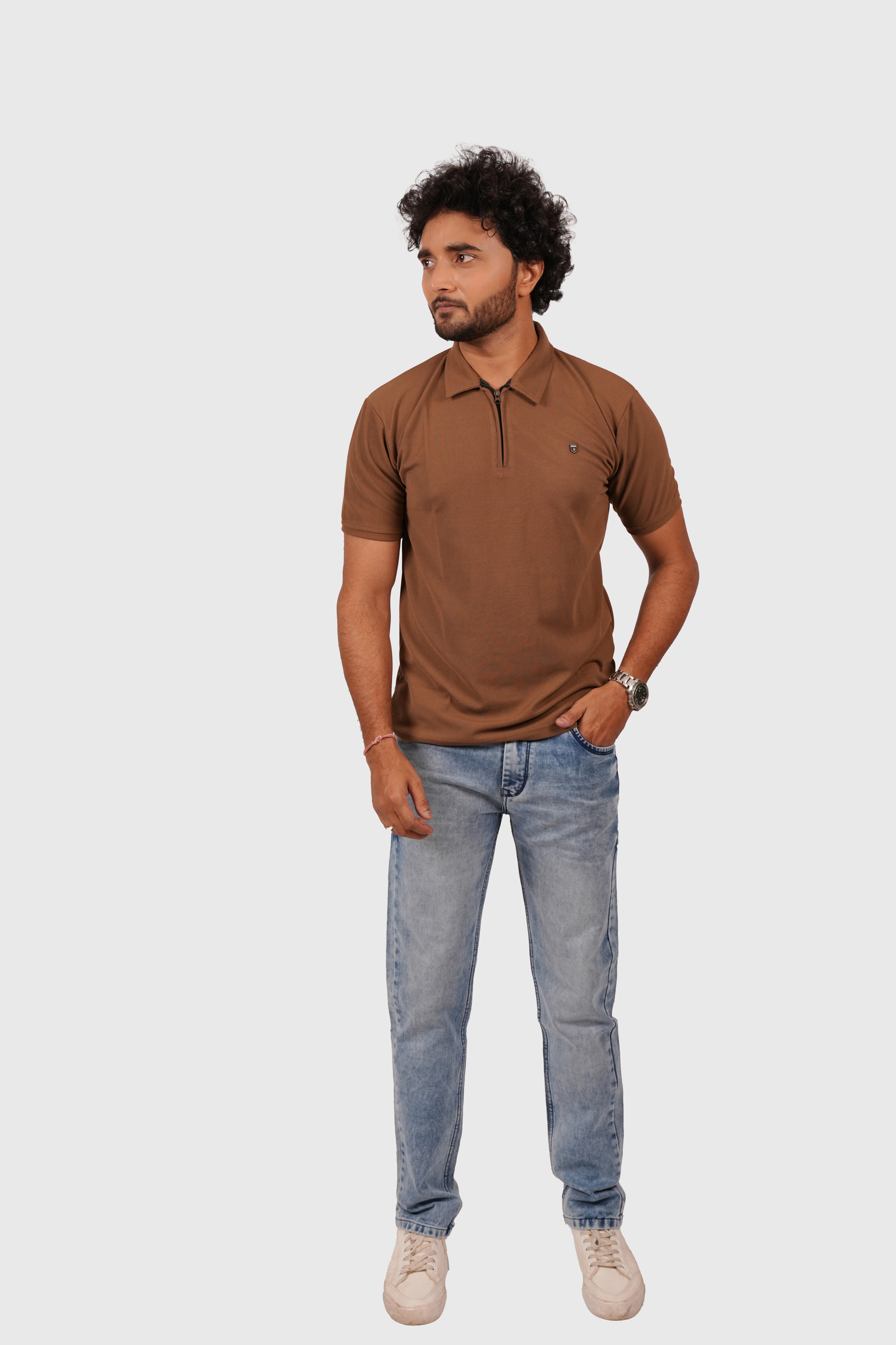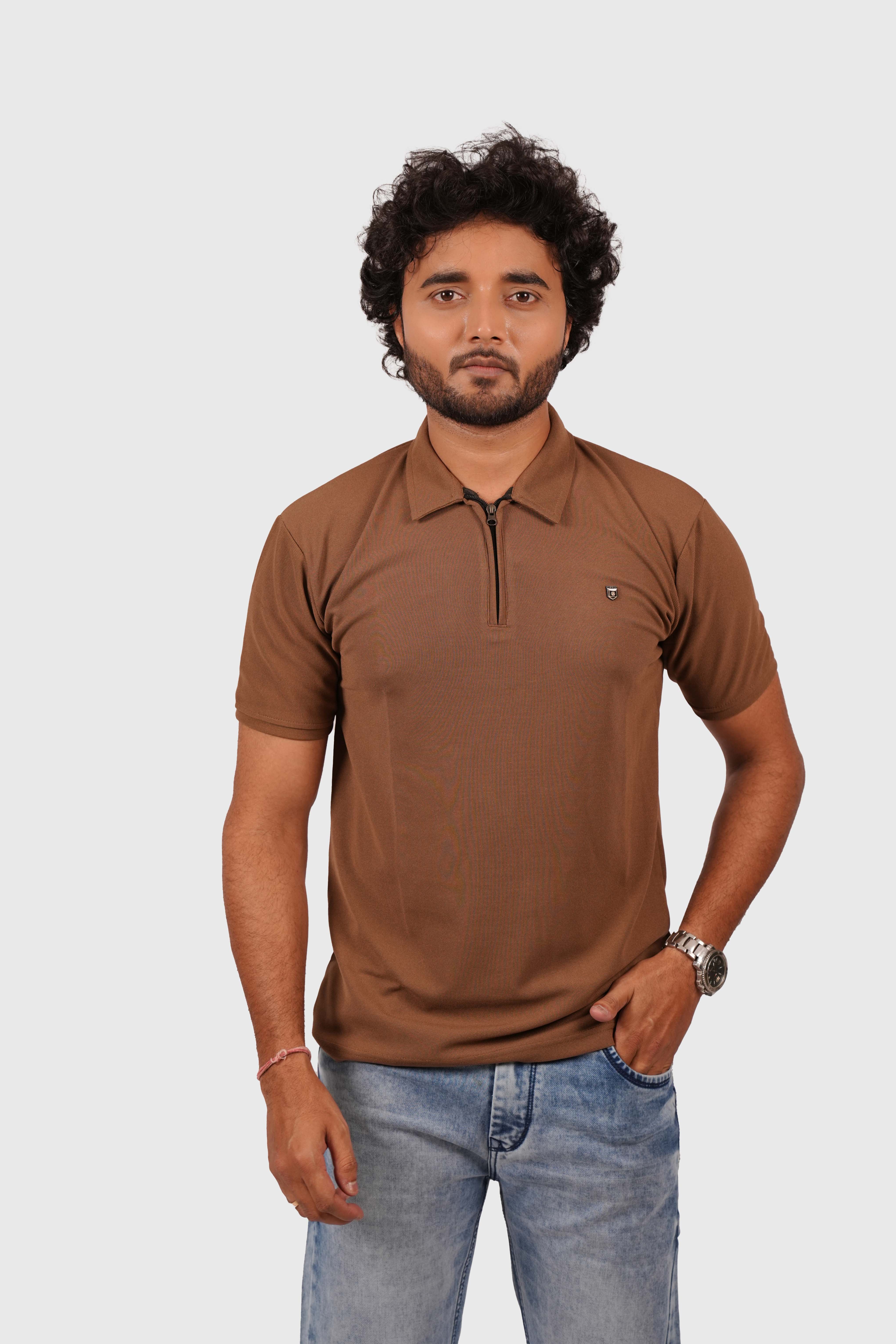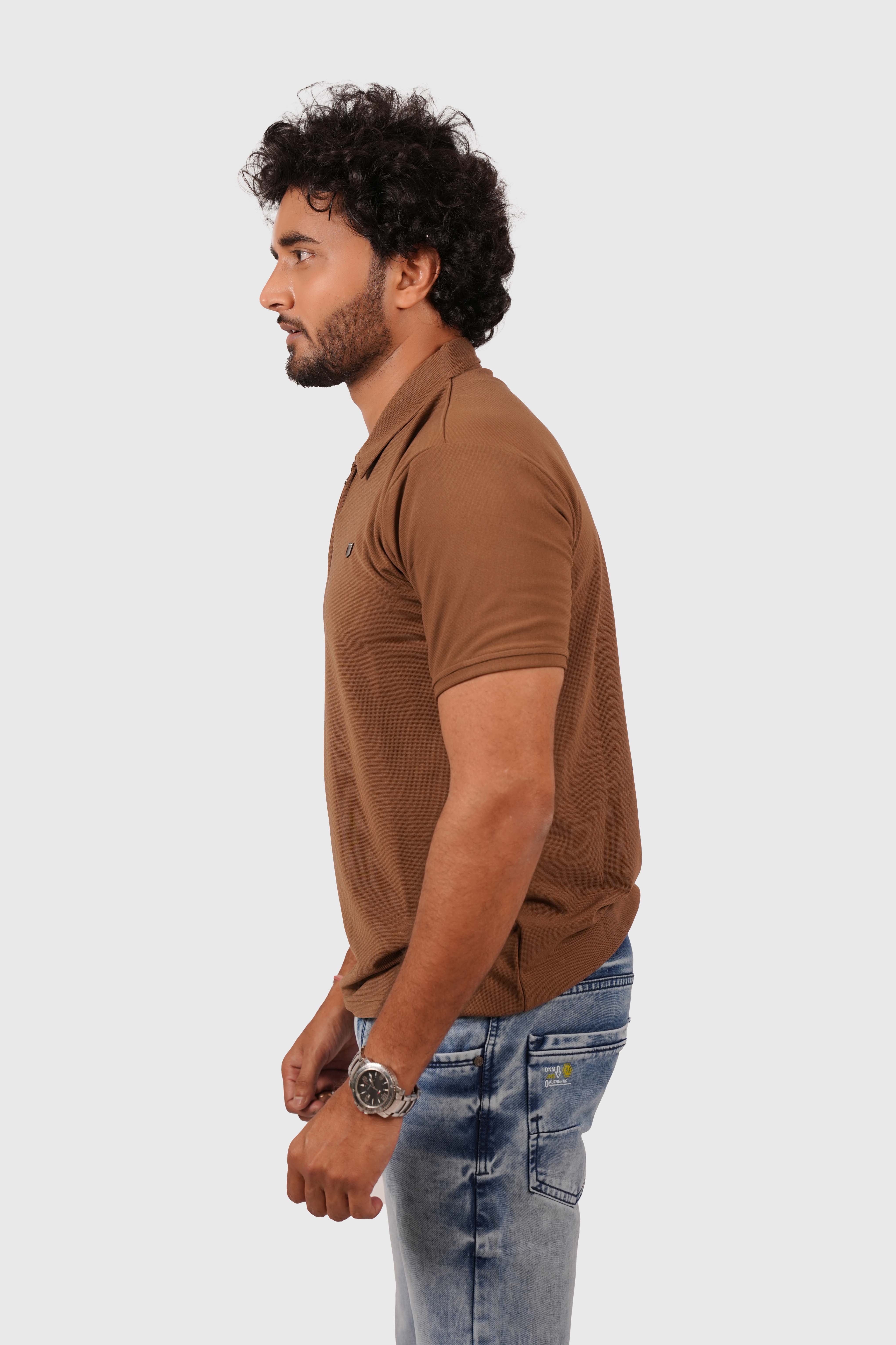 Men’s Brown Polo T-Shirt with Zip Collar – Casual Regular Fit