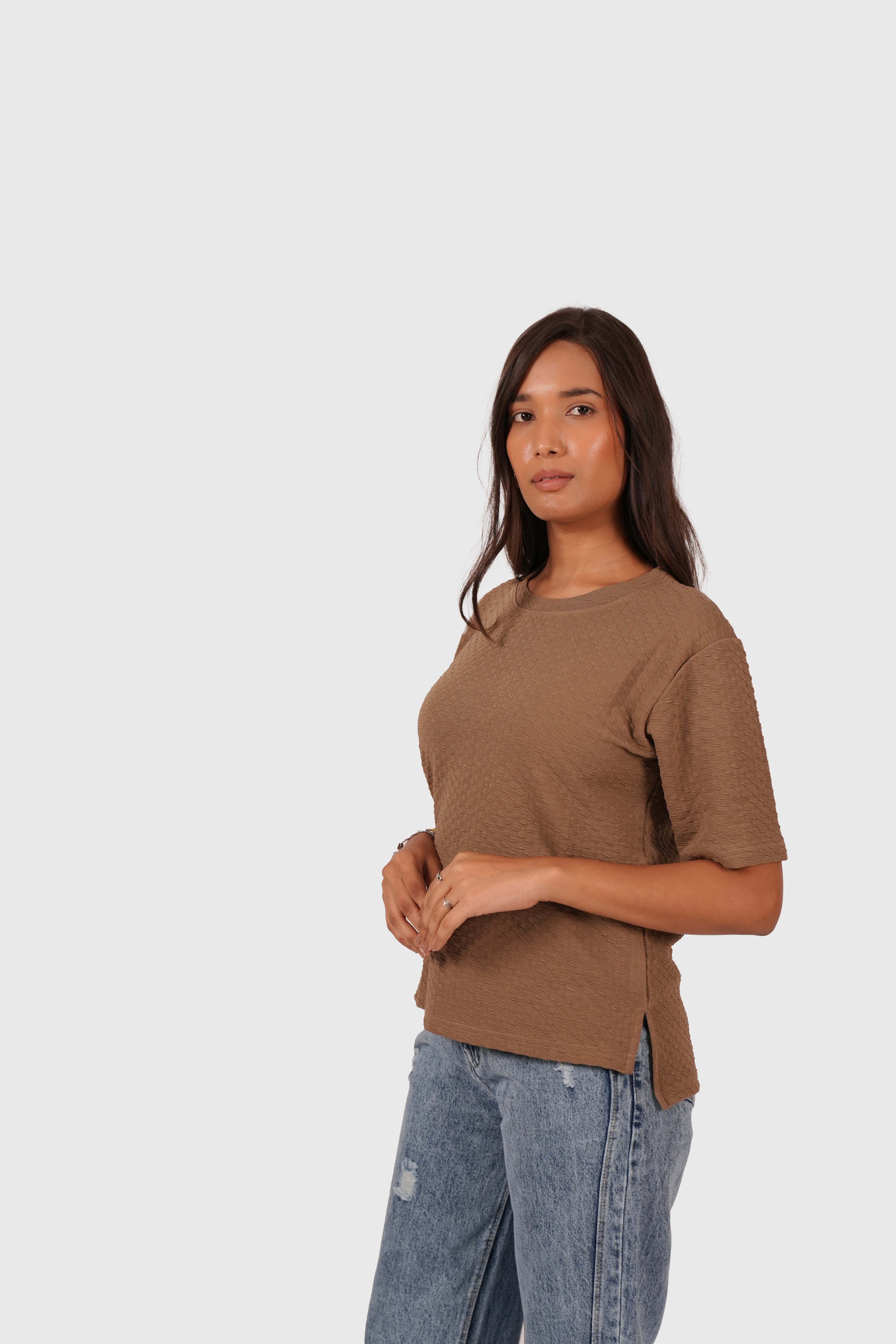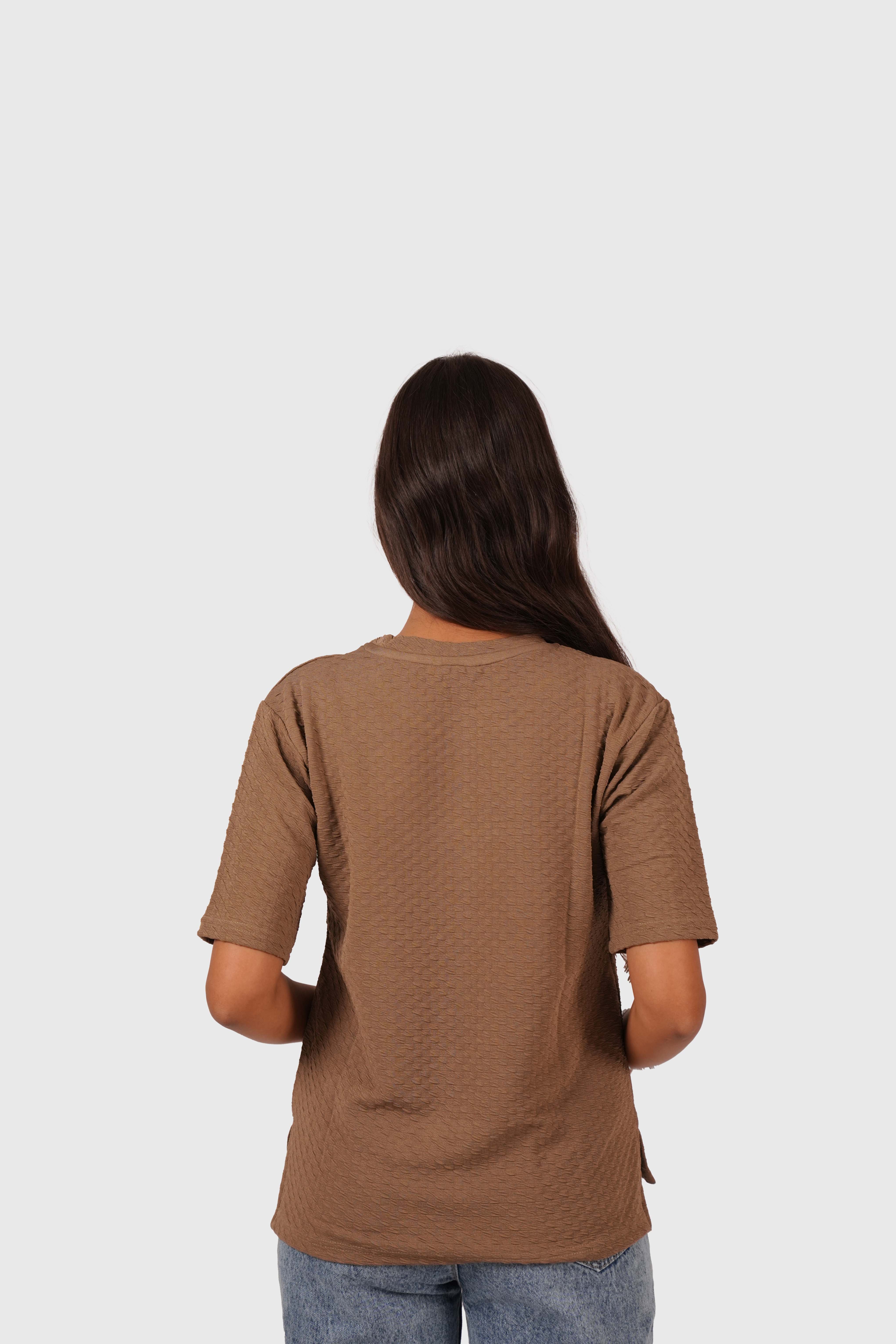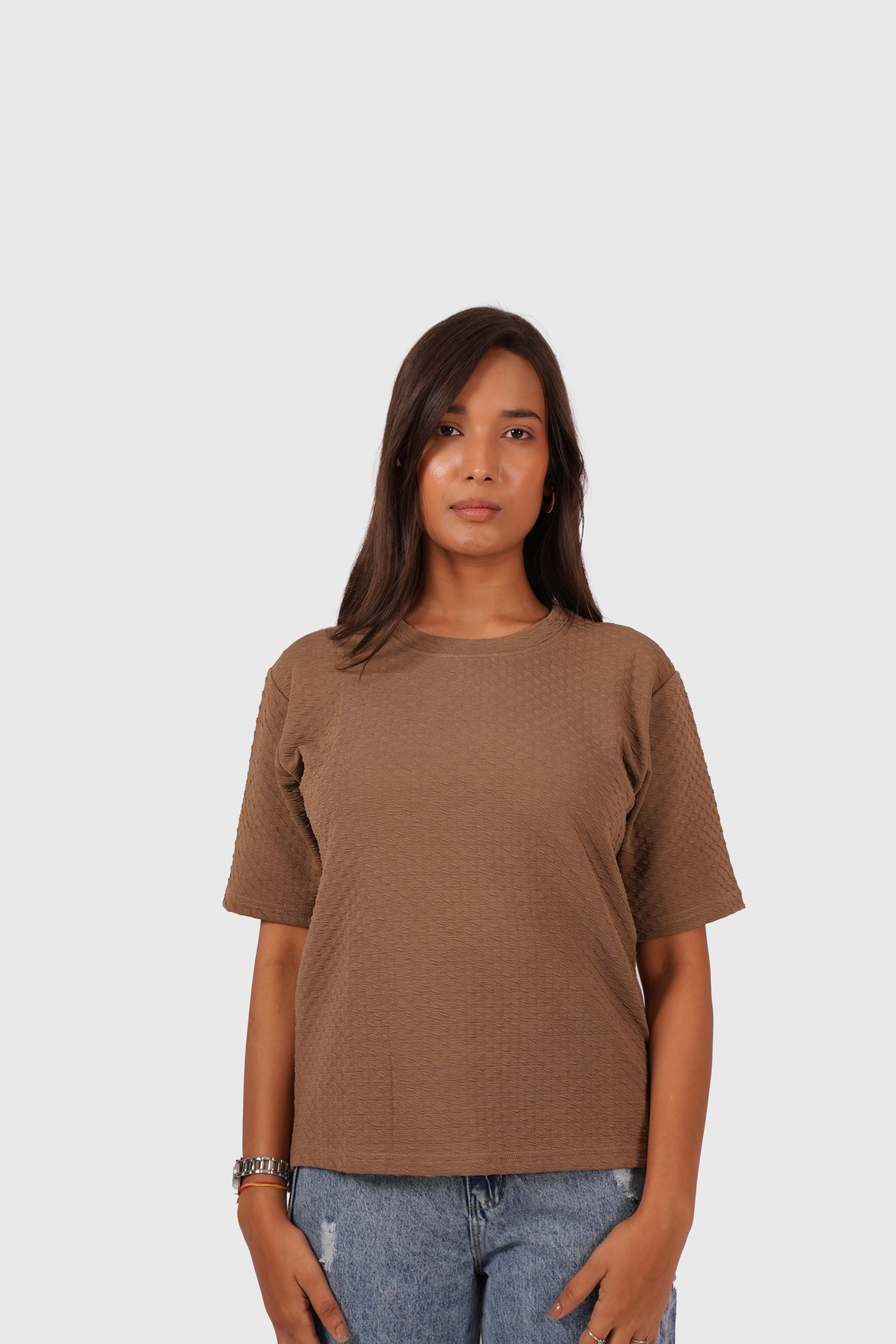 Crafted from imported stretchable fabric, this brown oversized T-shirt delivers effortless comfort with an earthy, fashion-forward vibe.