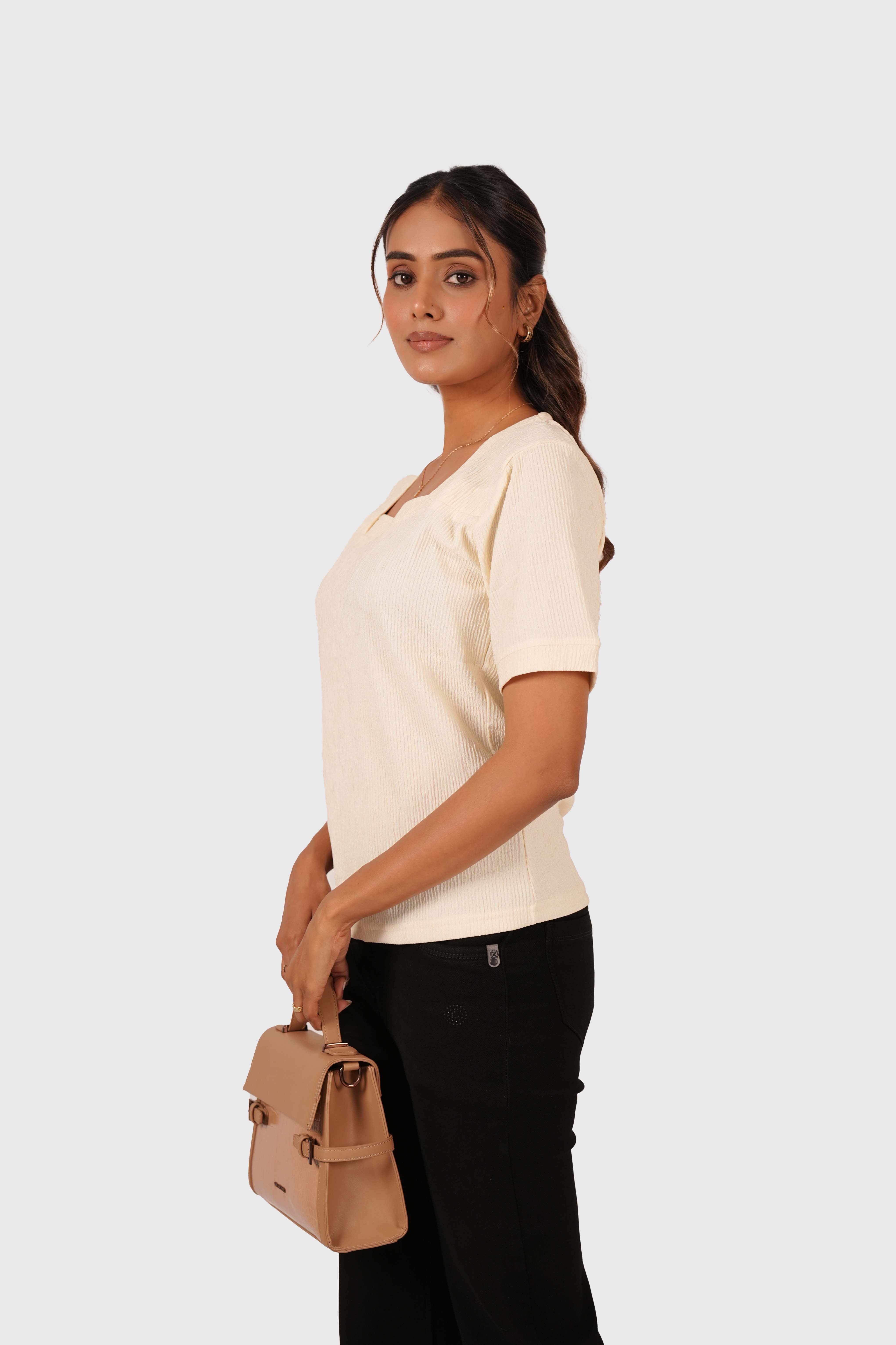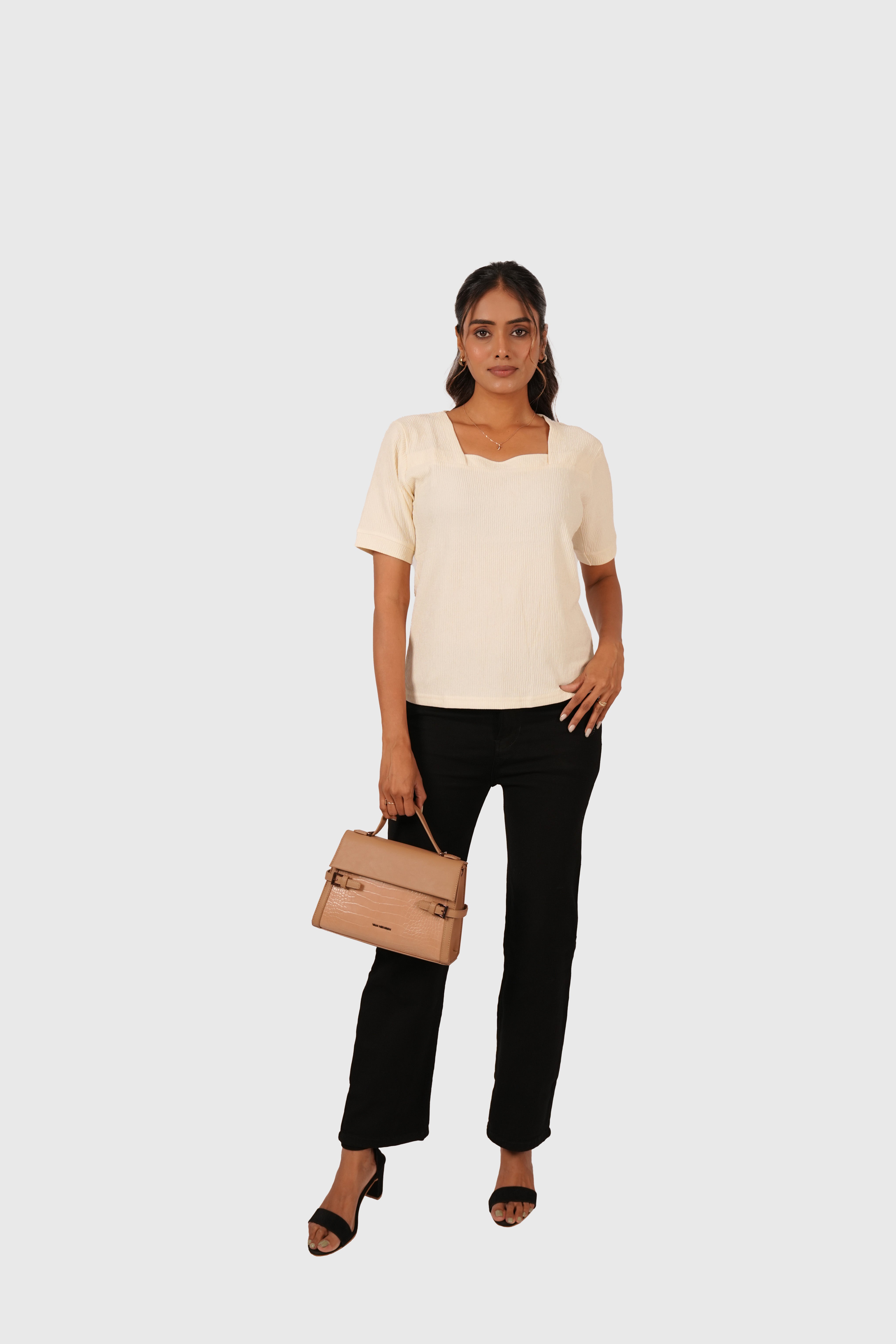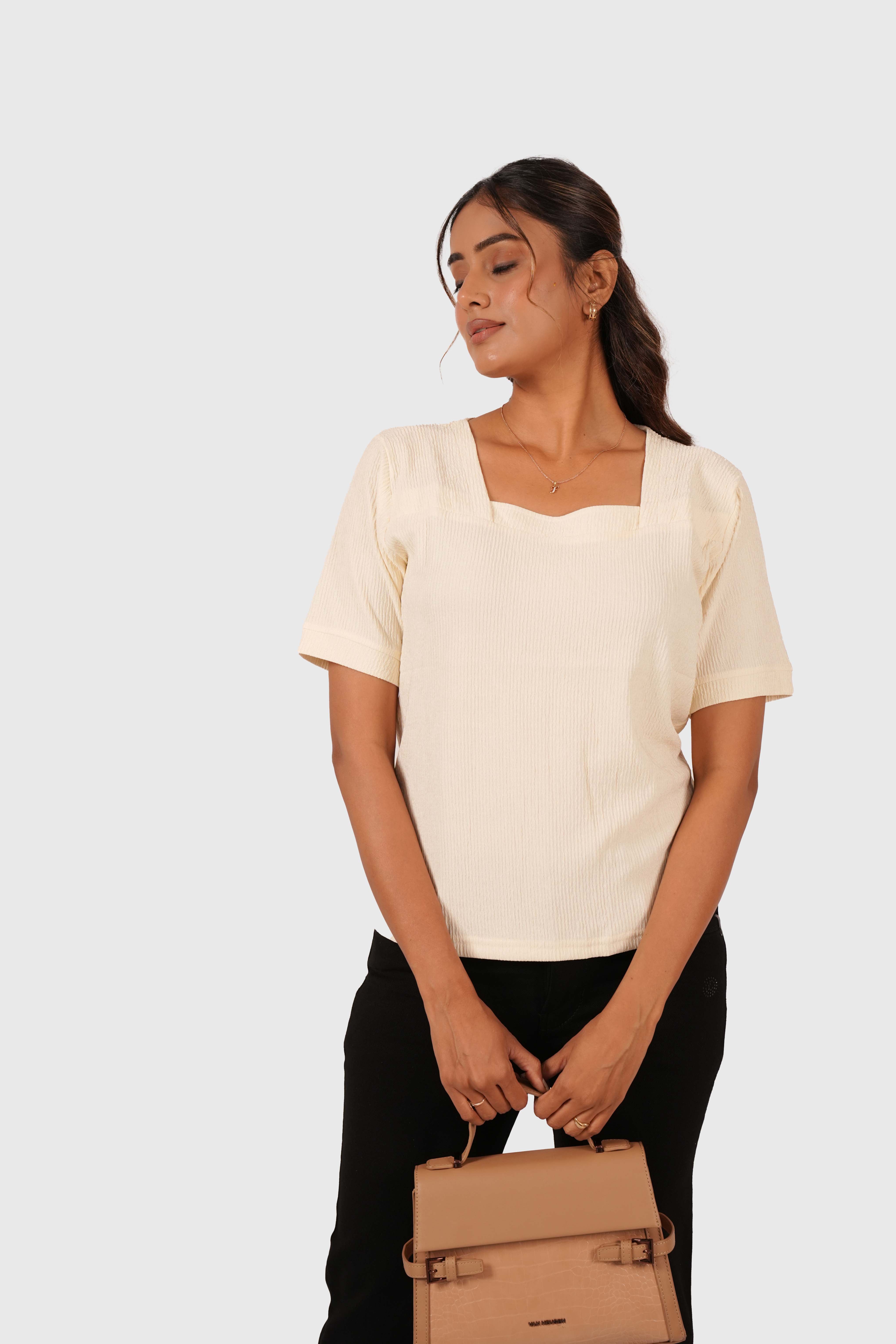 Cream square neck top in stretch fabric offering effortless comfort and versatile style for any occasion.