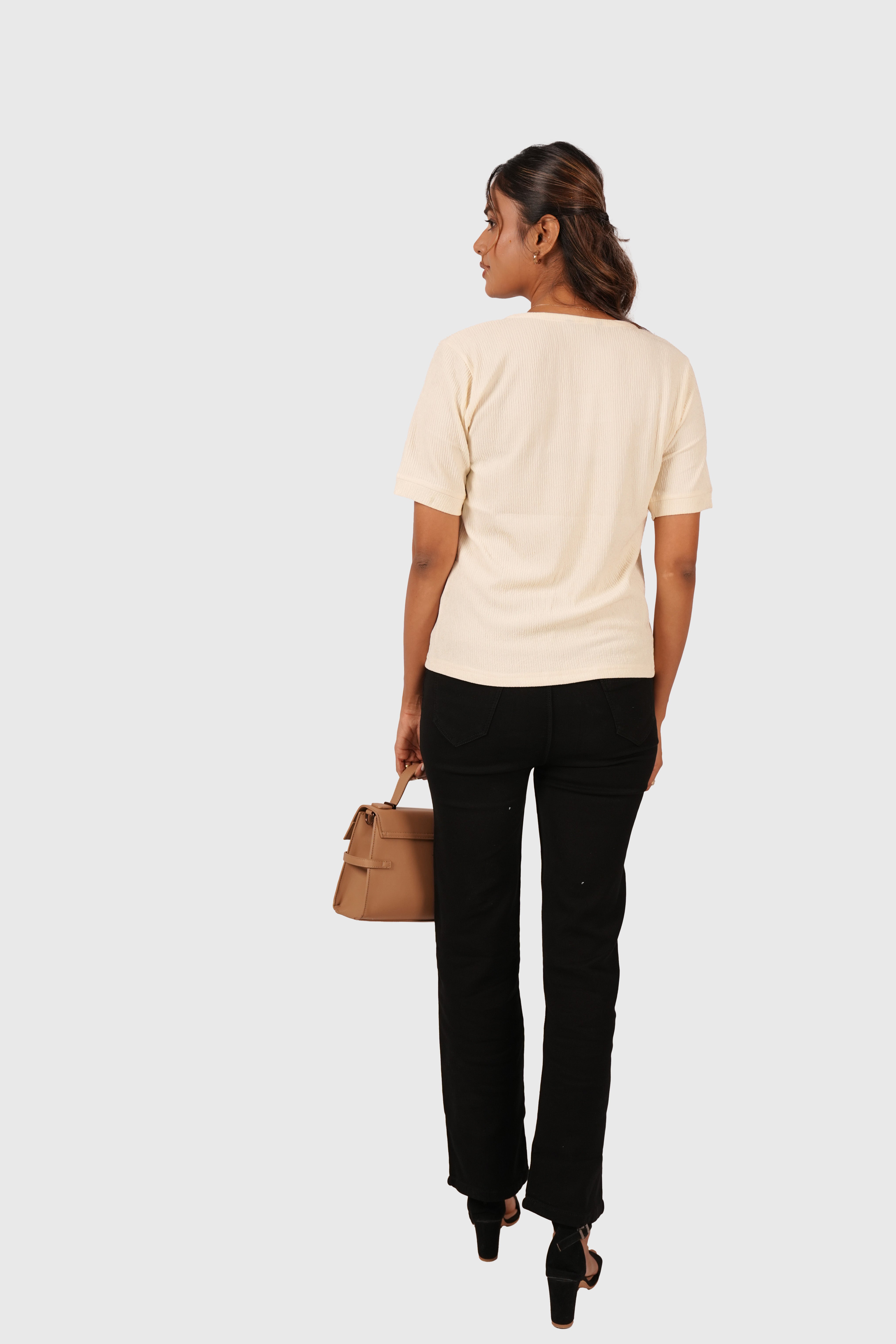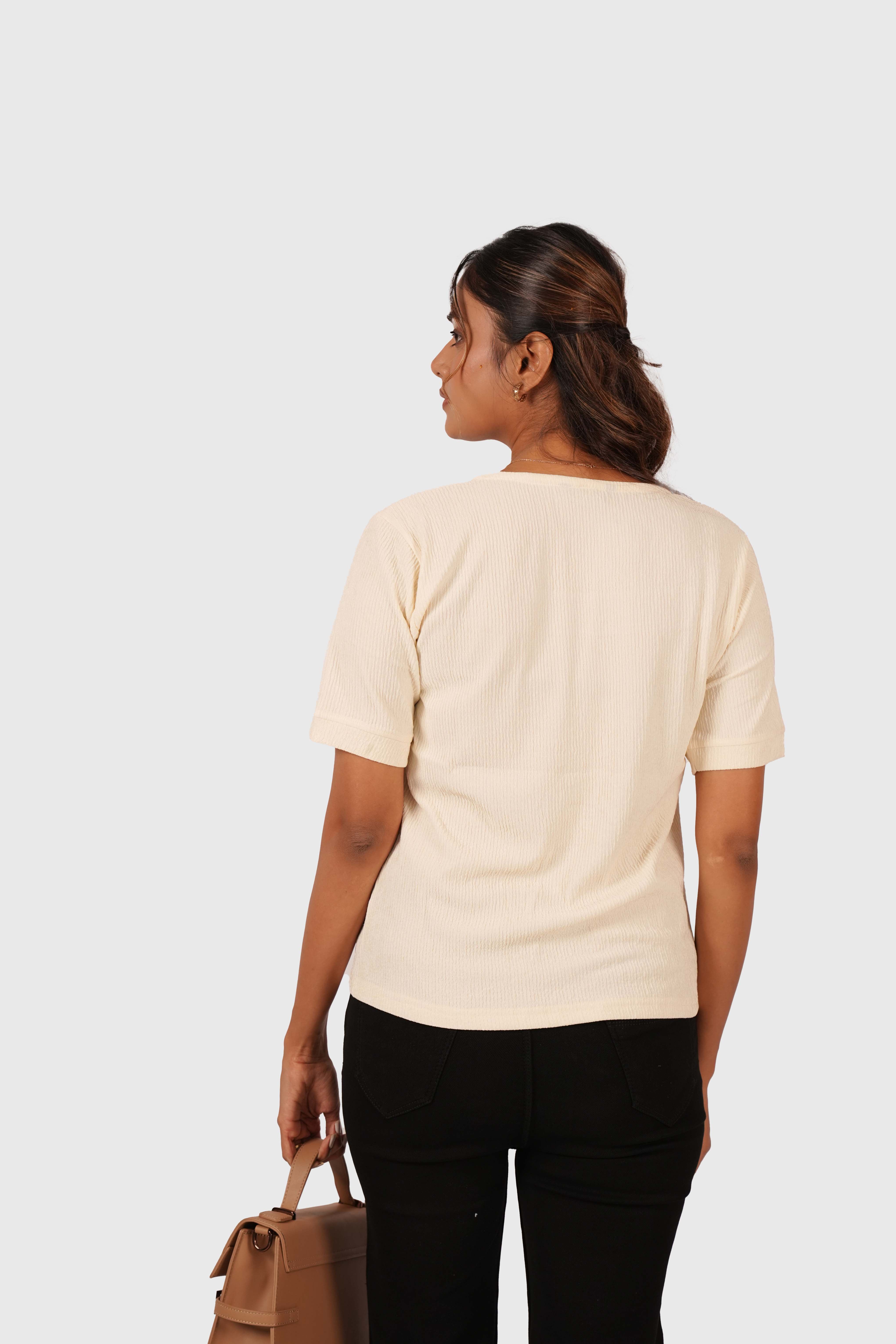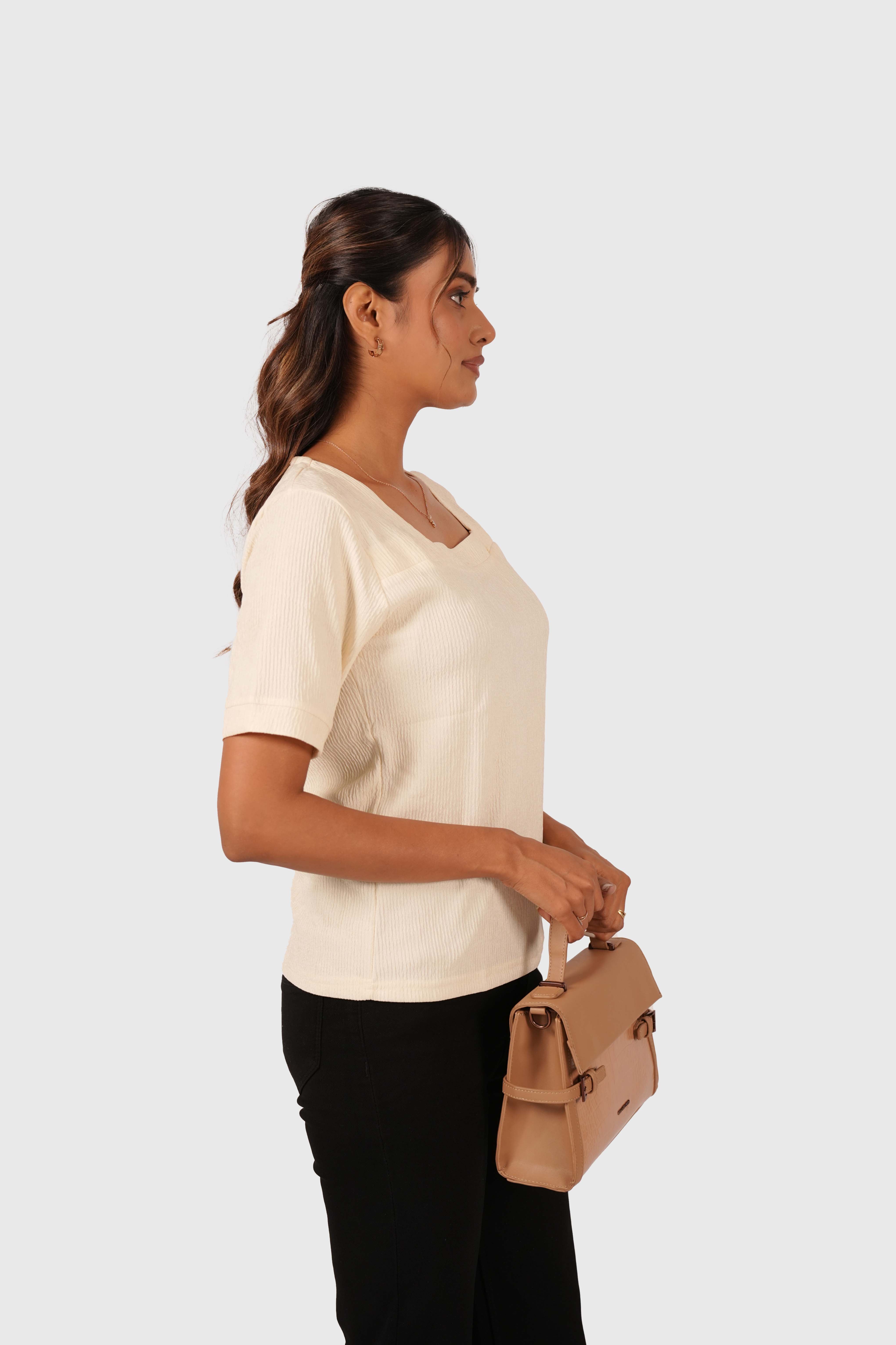 Cream square neck top in stretch fabric offering effortless comfort and versatile style for any occasion.