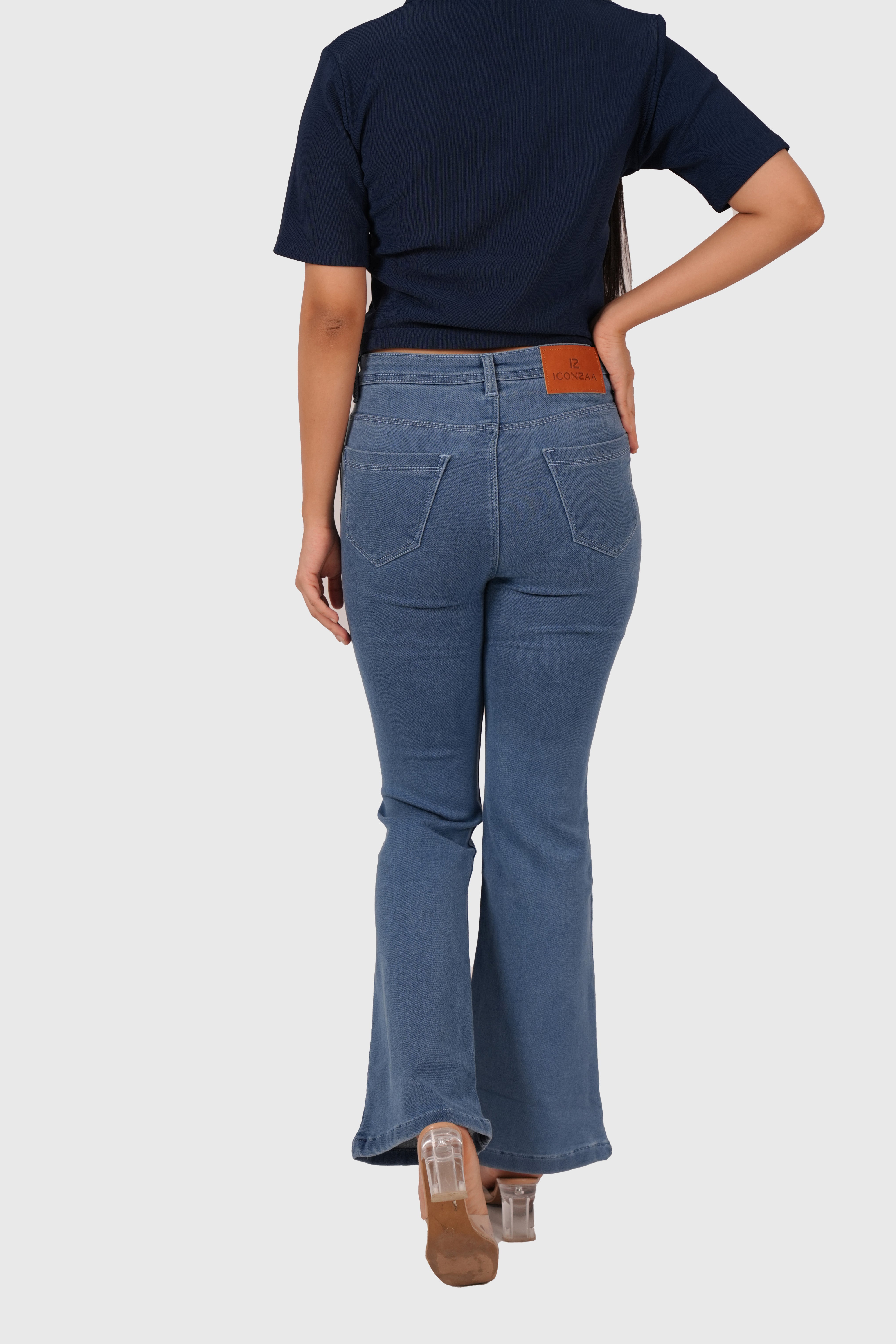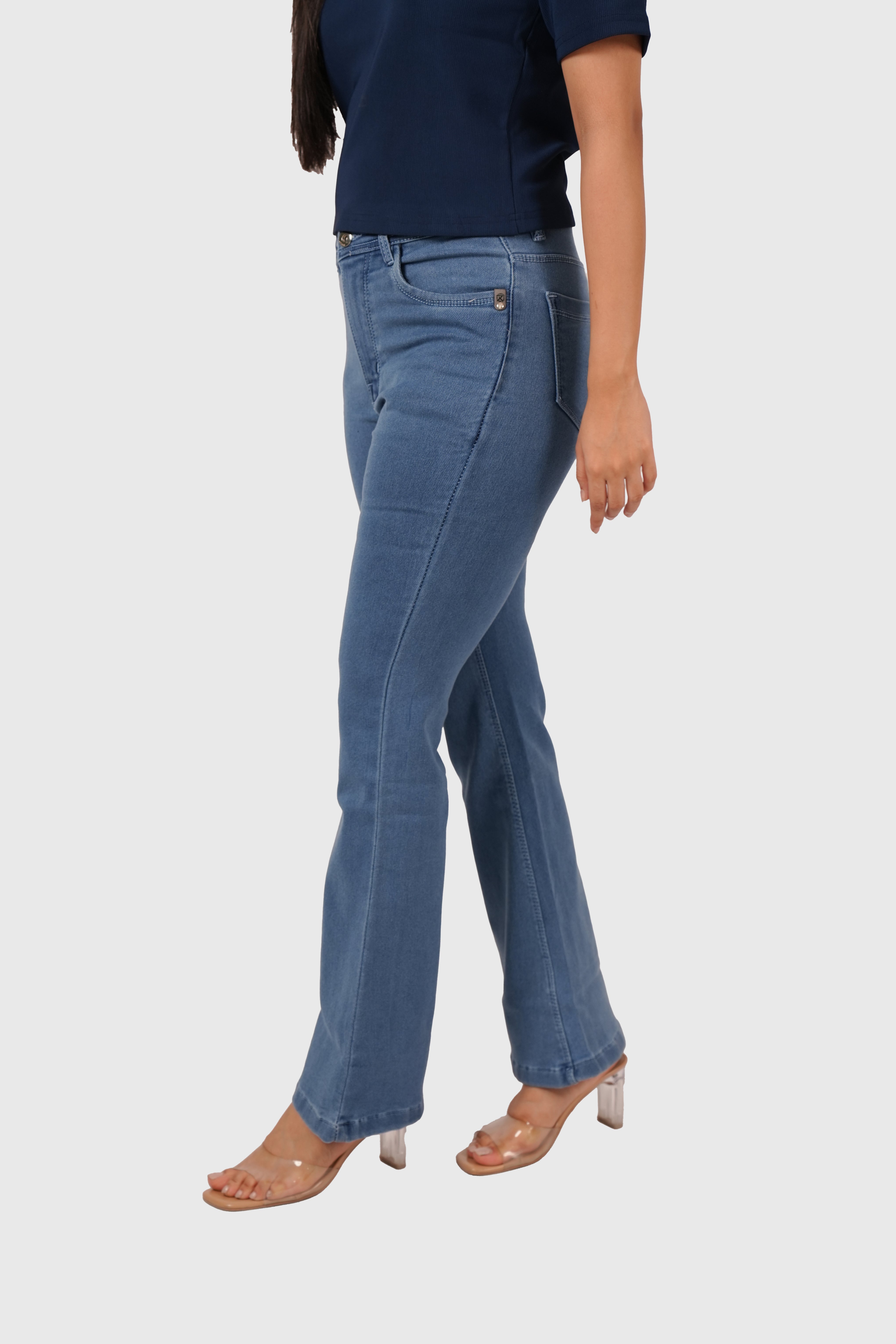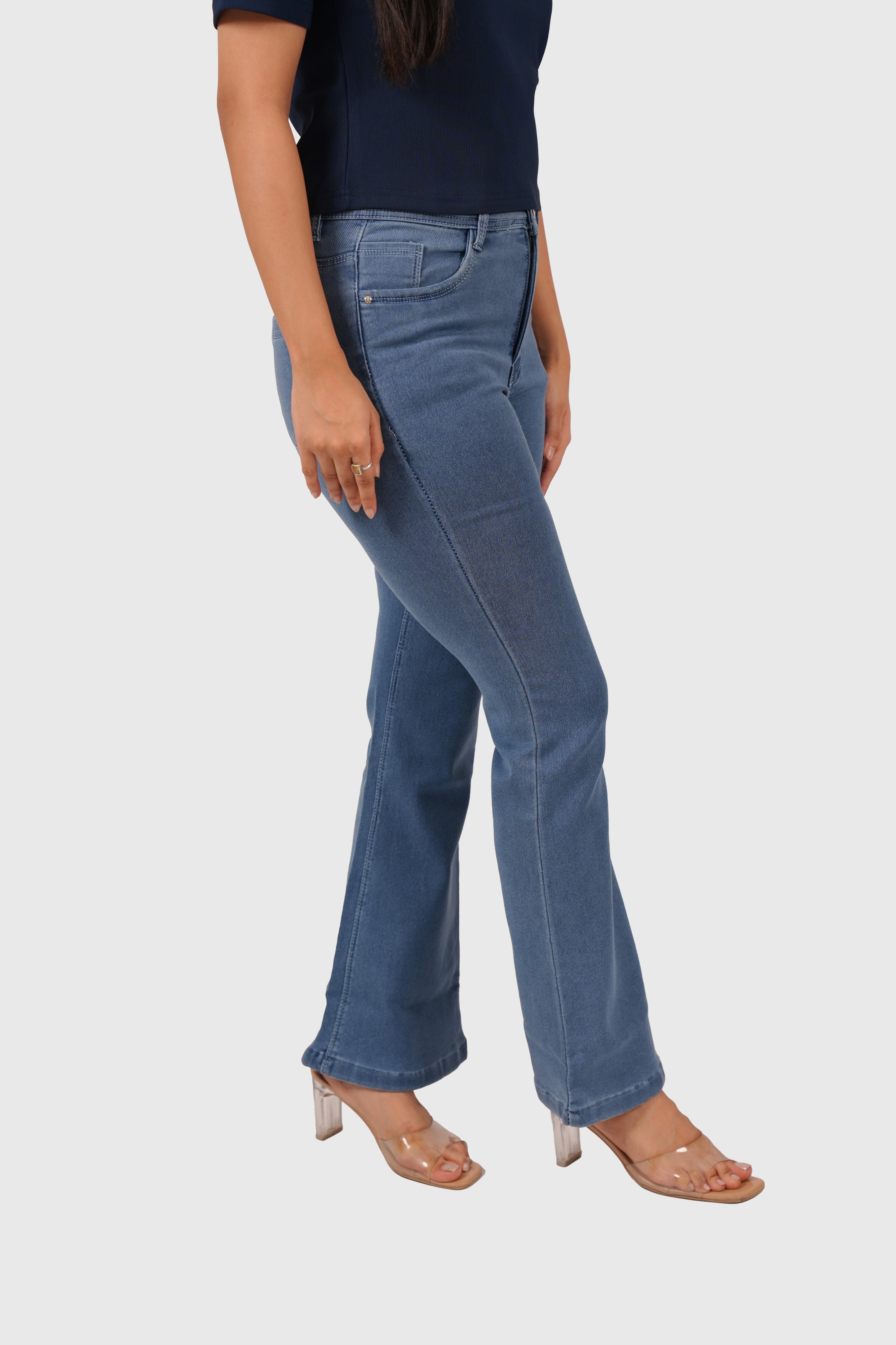 Light blue bell bottom jeans with a vintage cut and stretch denim comfort for a bold, versatile style.