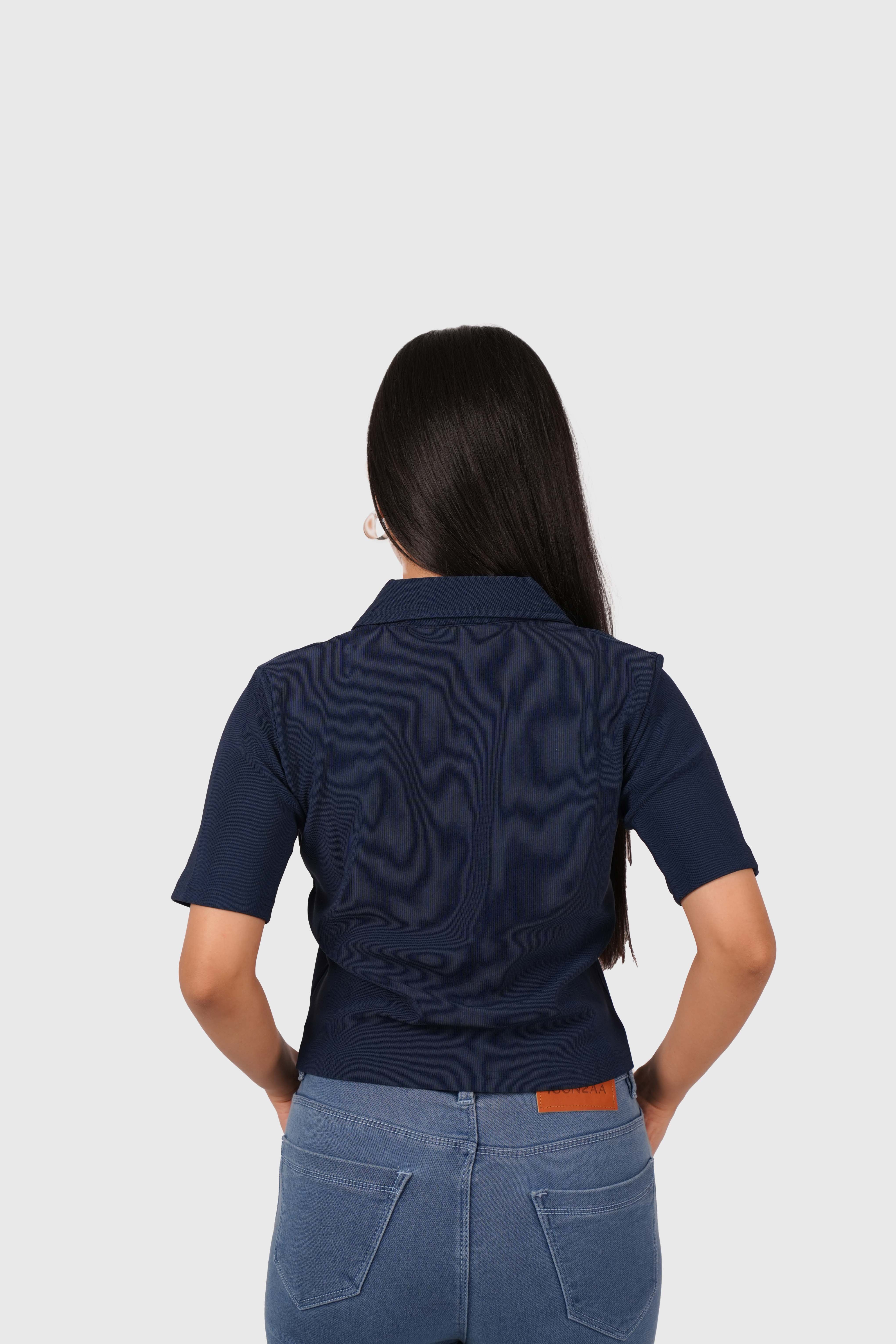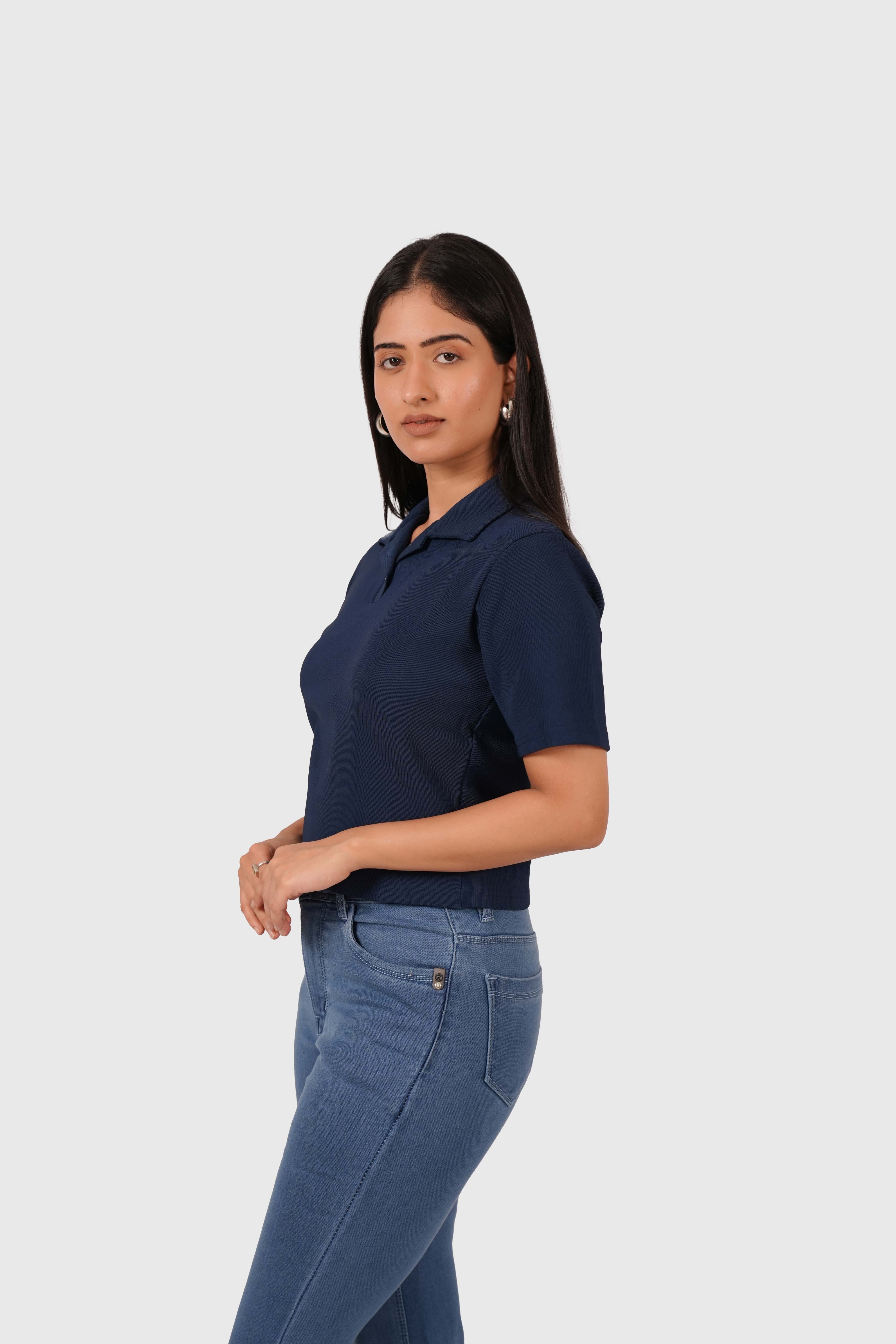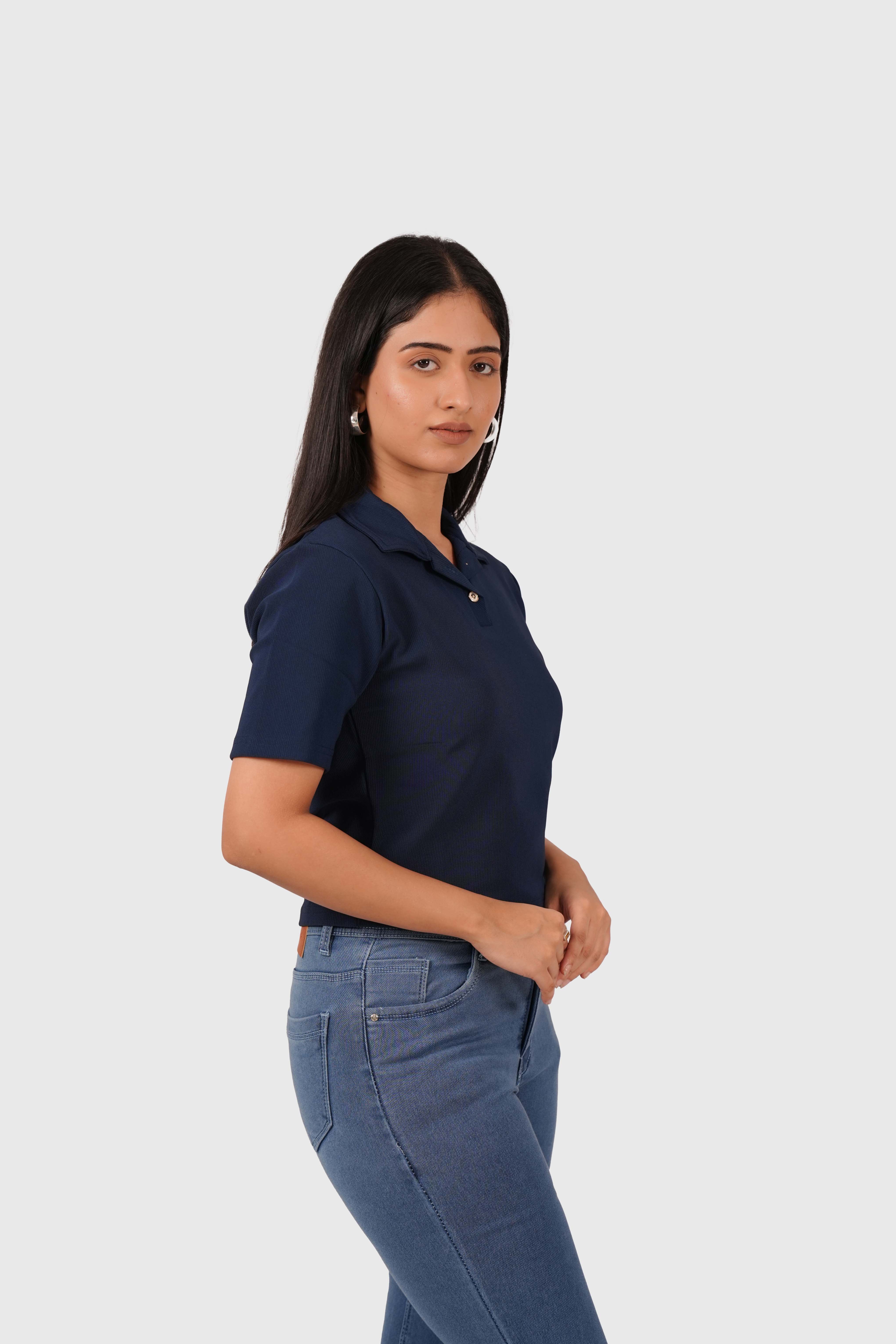 Women’s Navy Blue Polo Crop T-Shirt with Button