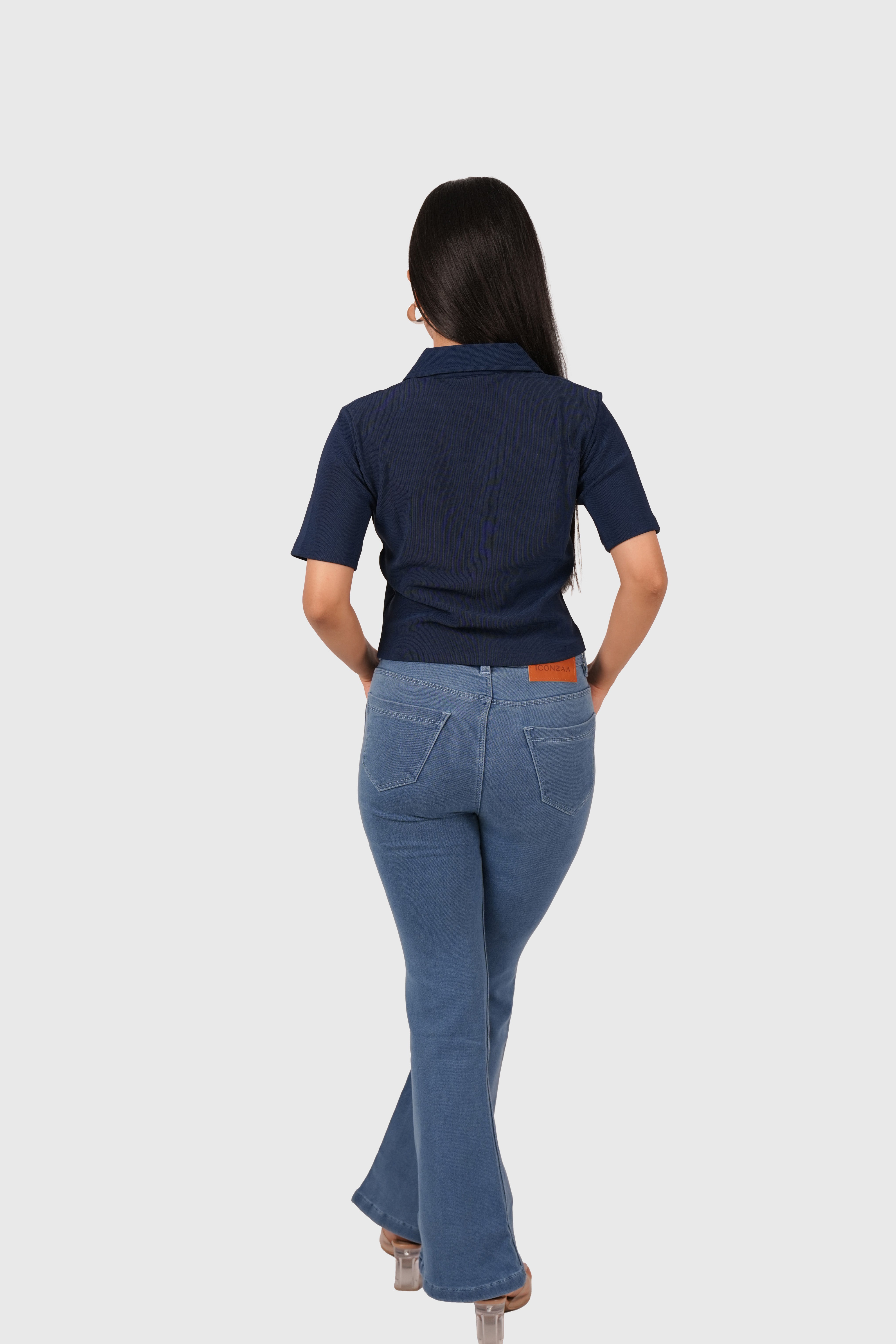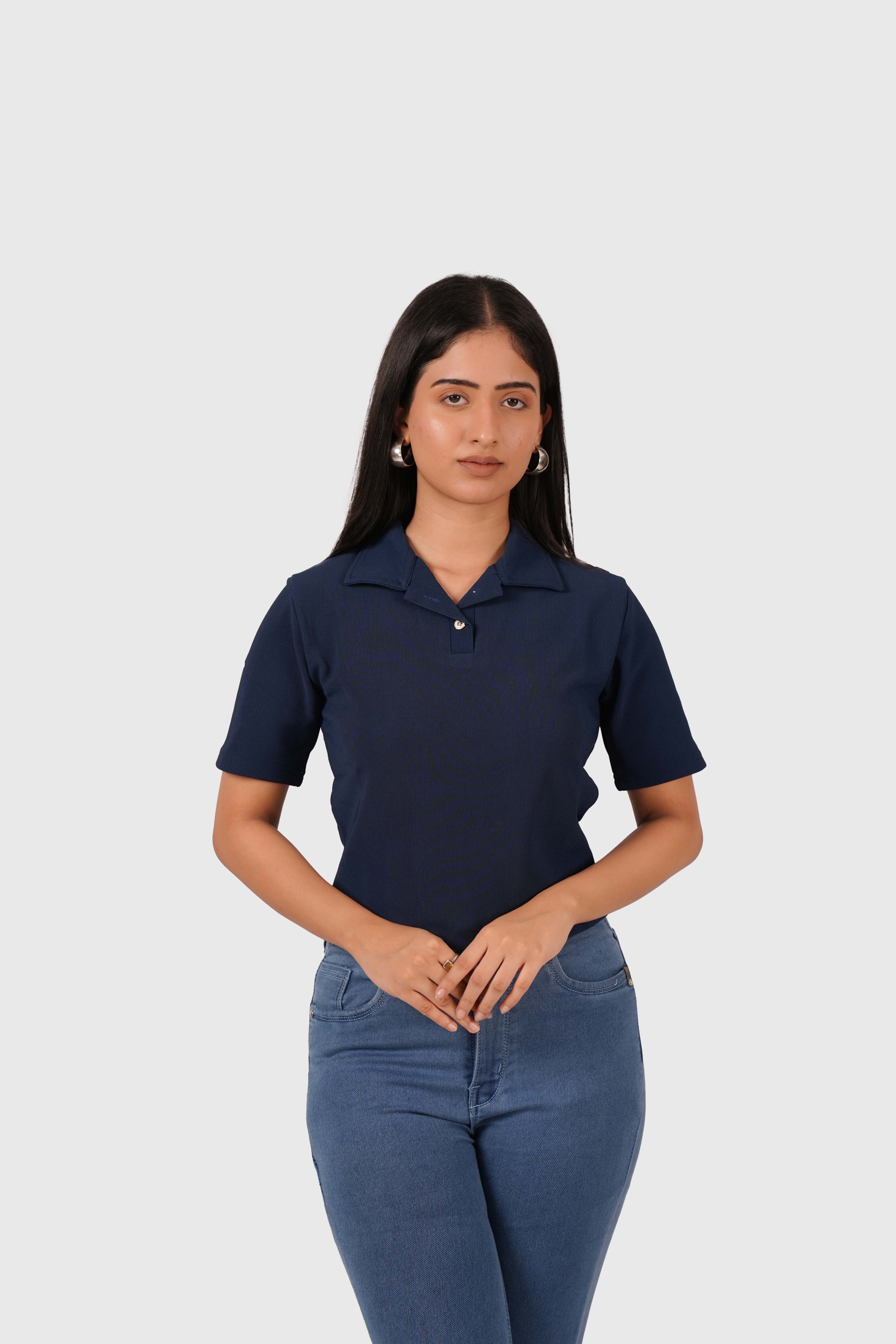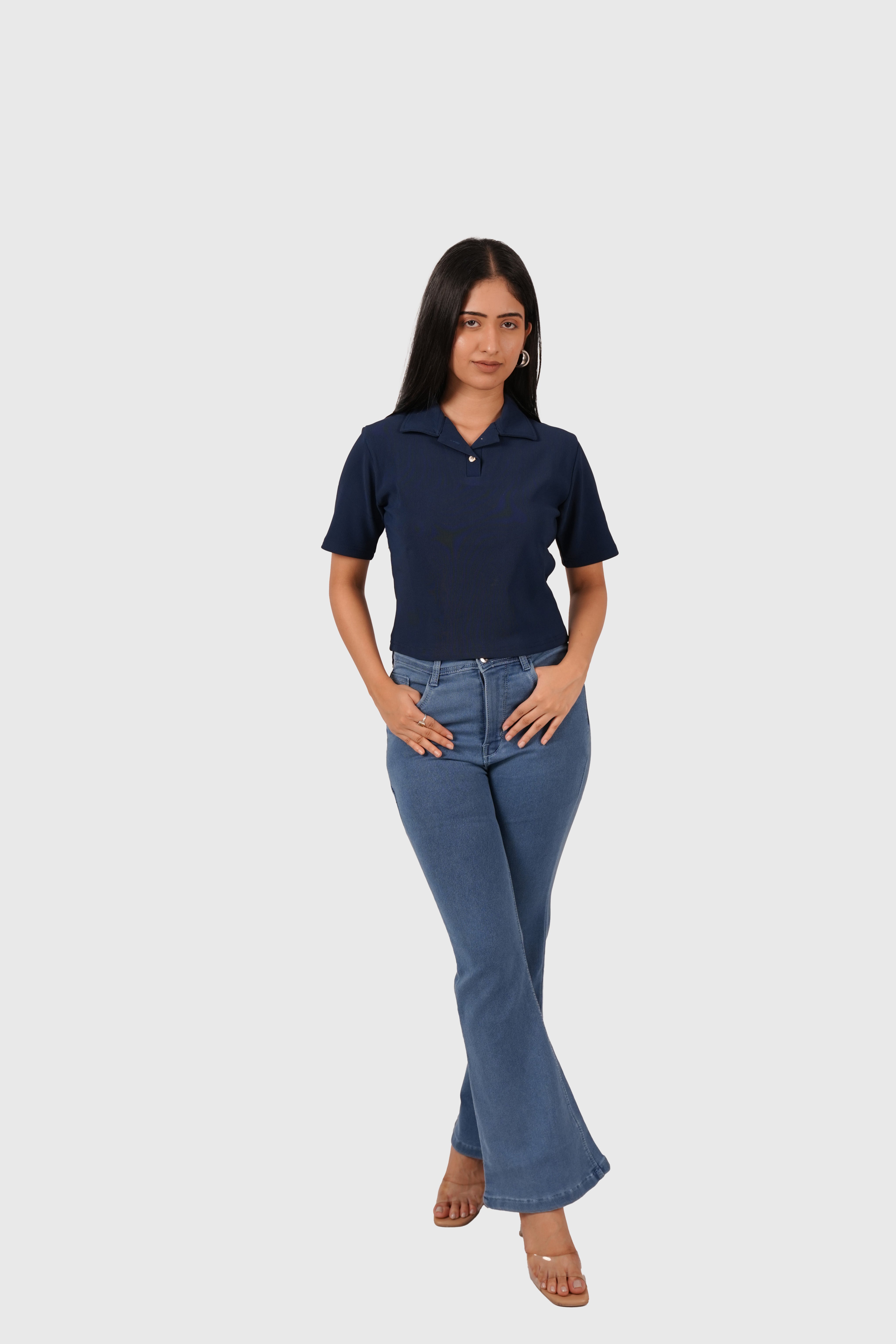 Women’s Navy Blue Polo Crop T-Shirt with Button