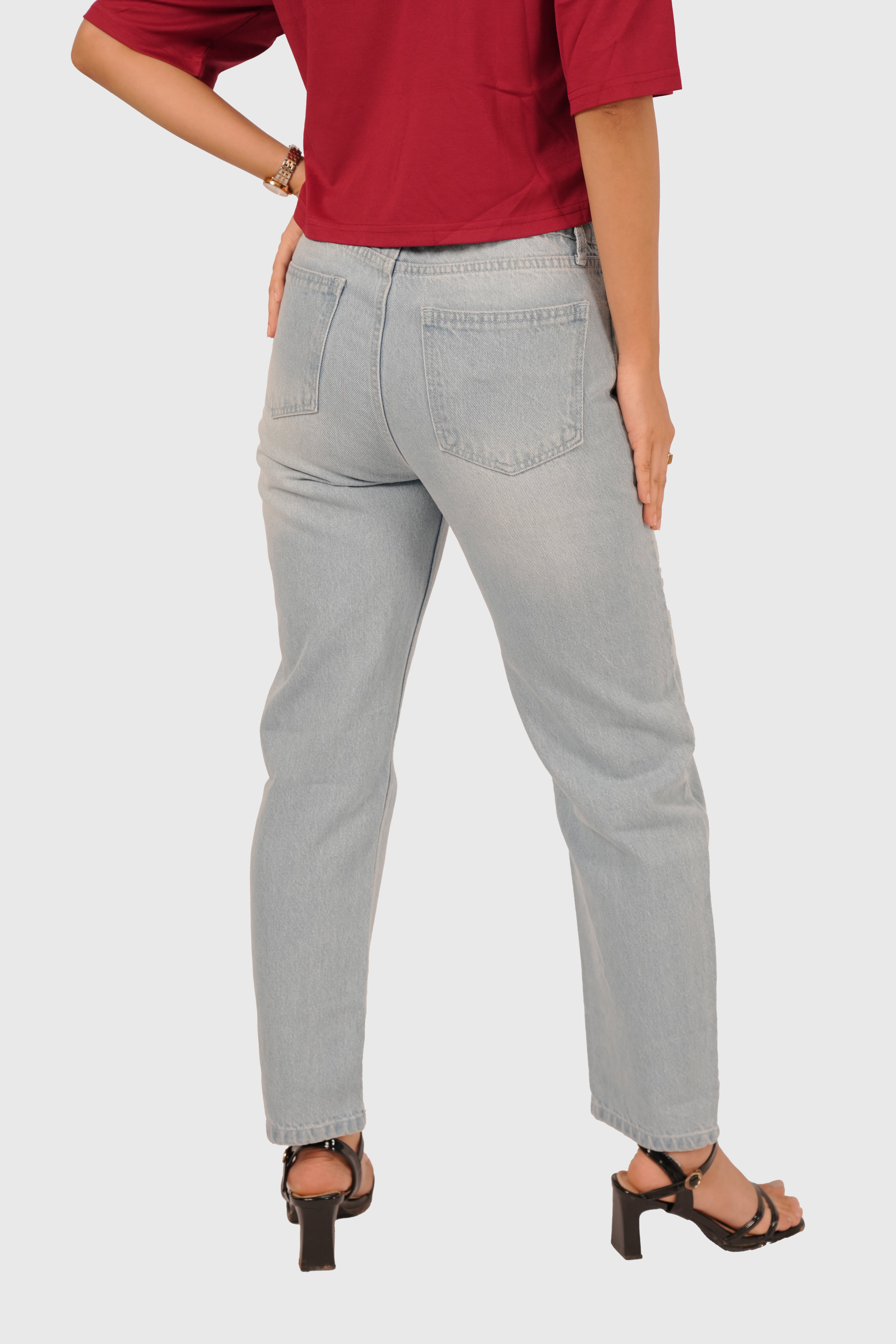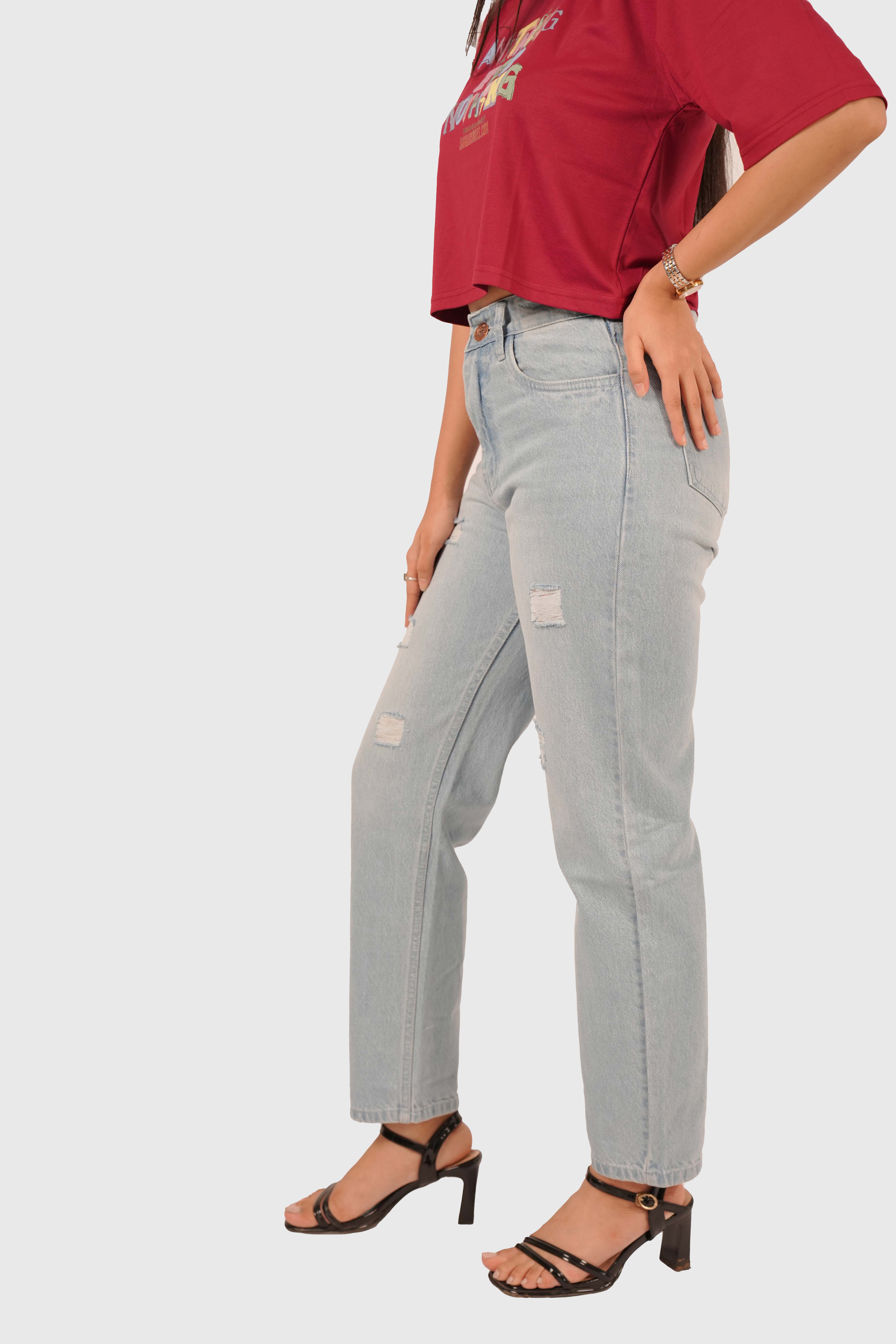 Women’s Light Wash Blue Elastic Waist Mom Fit Torn Jeans