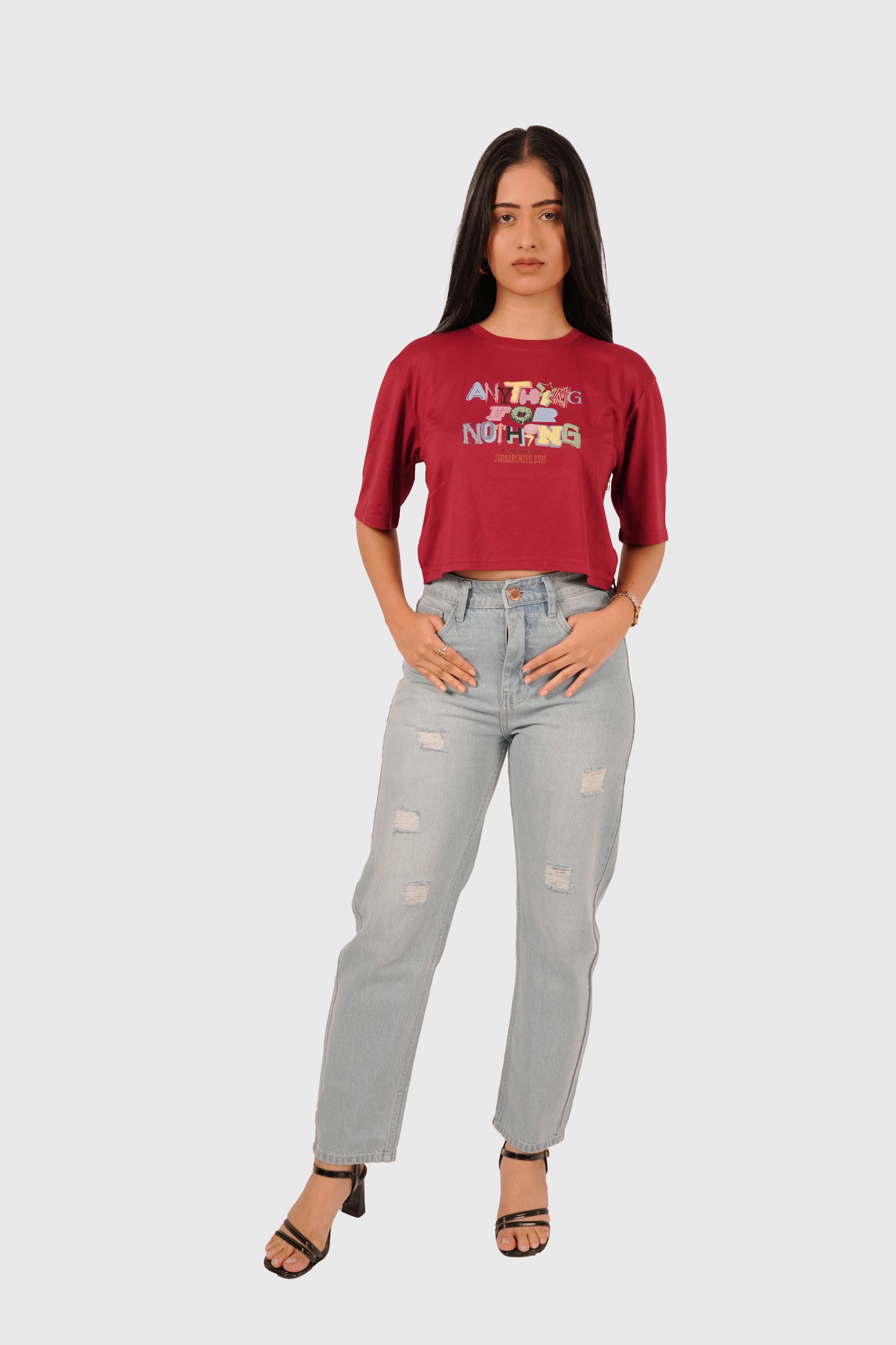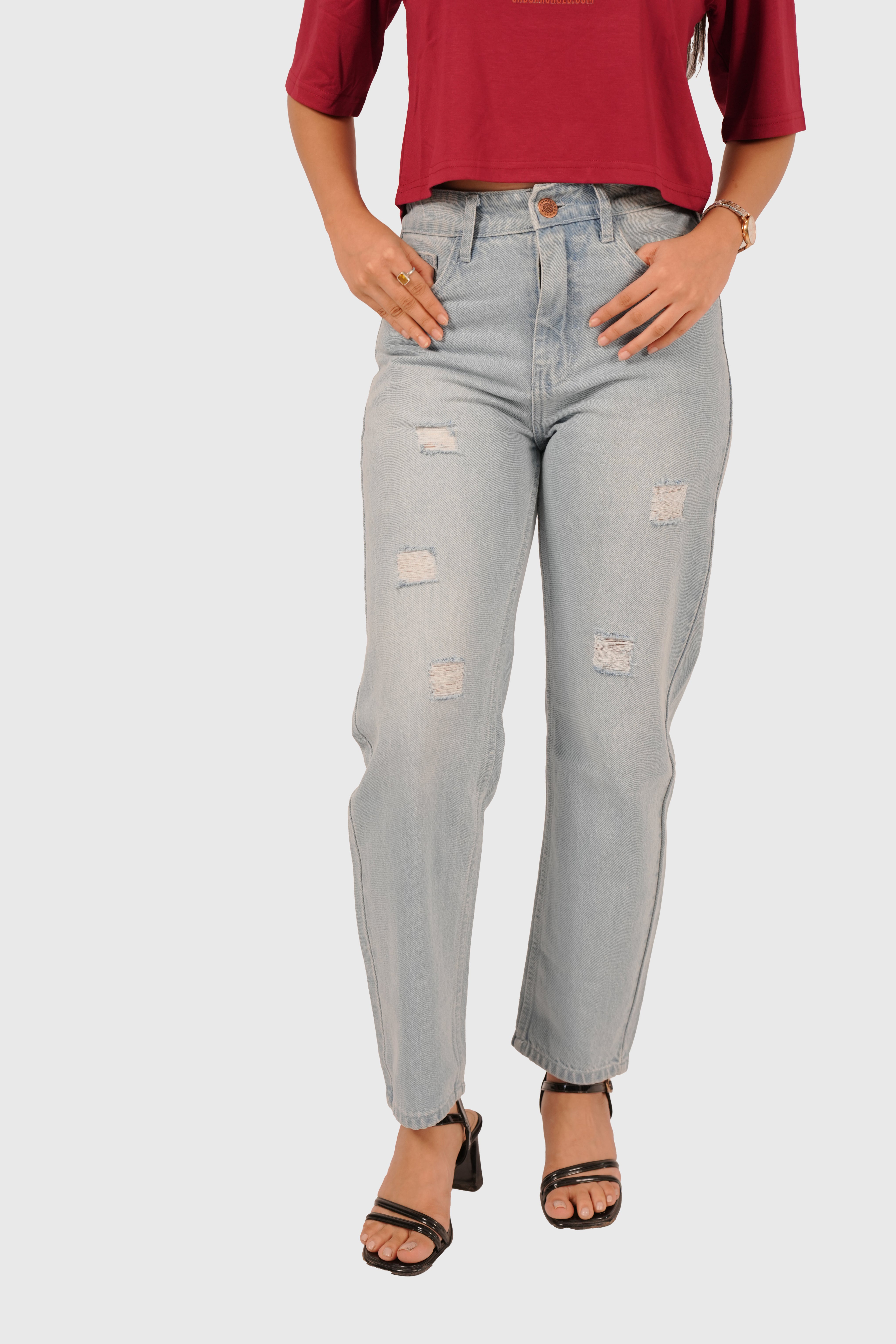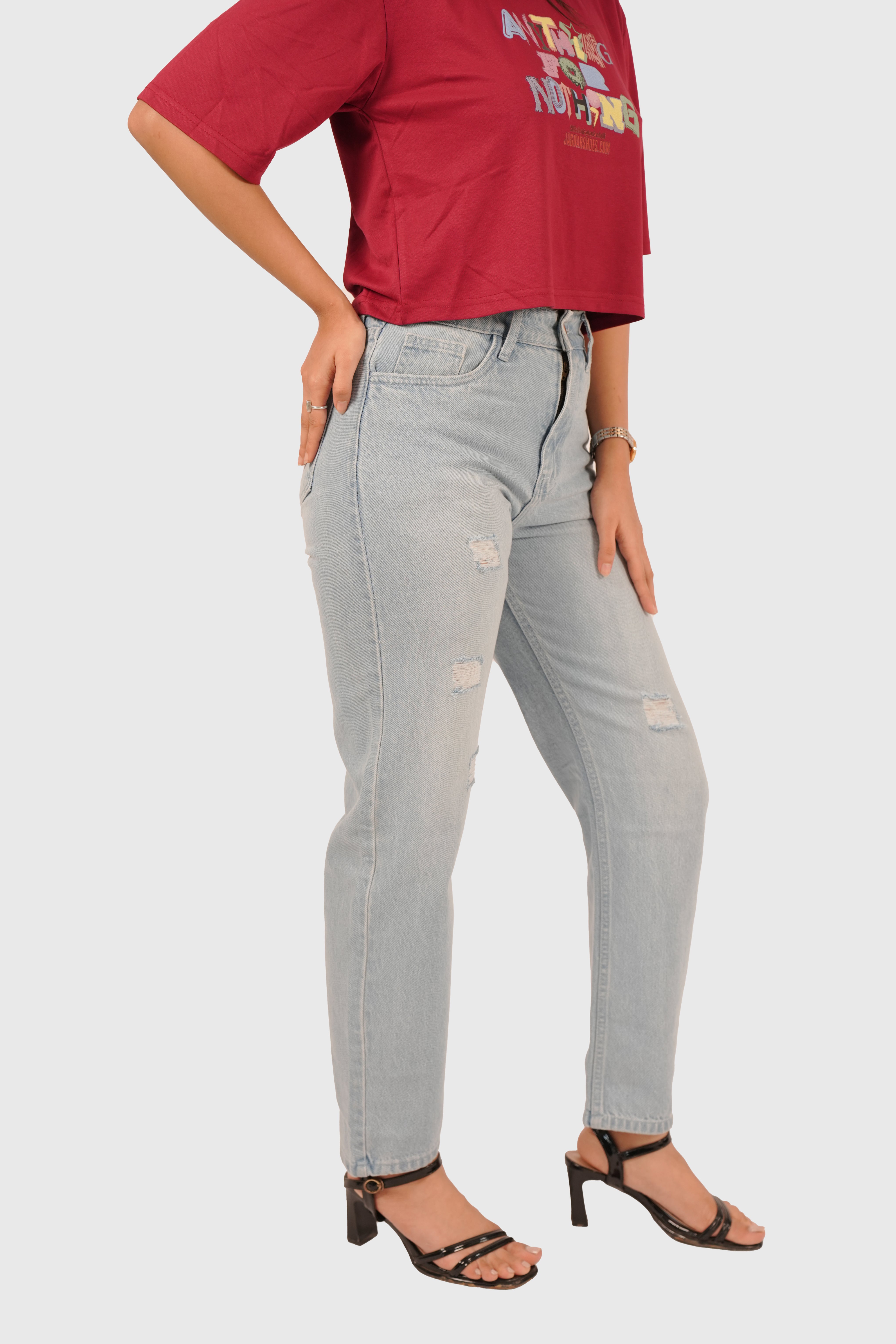 Light wash torn mom-fit jeans with an elastic waist, blending casual comfort and edgy distressed style.