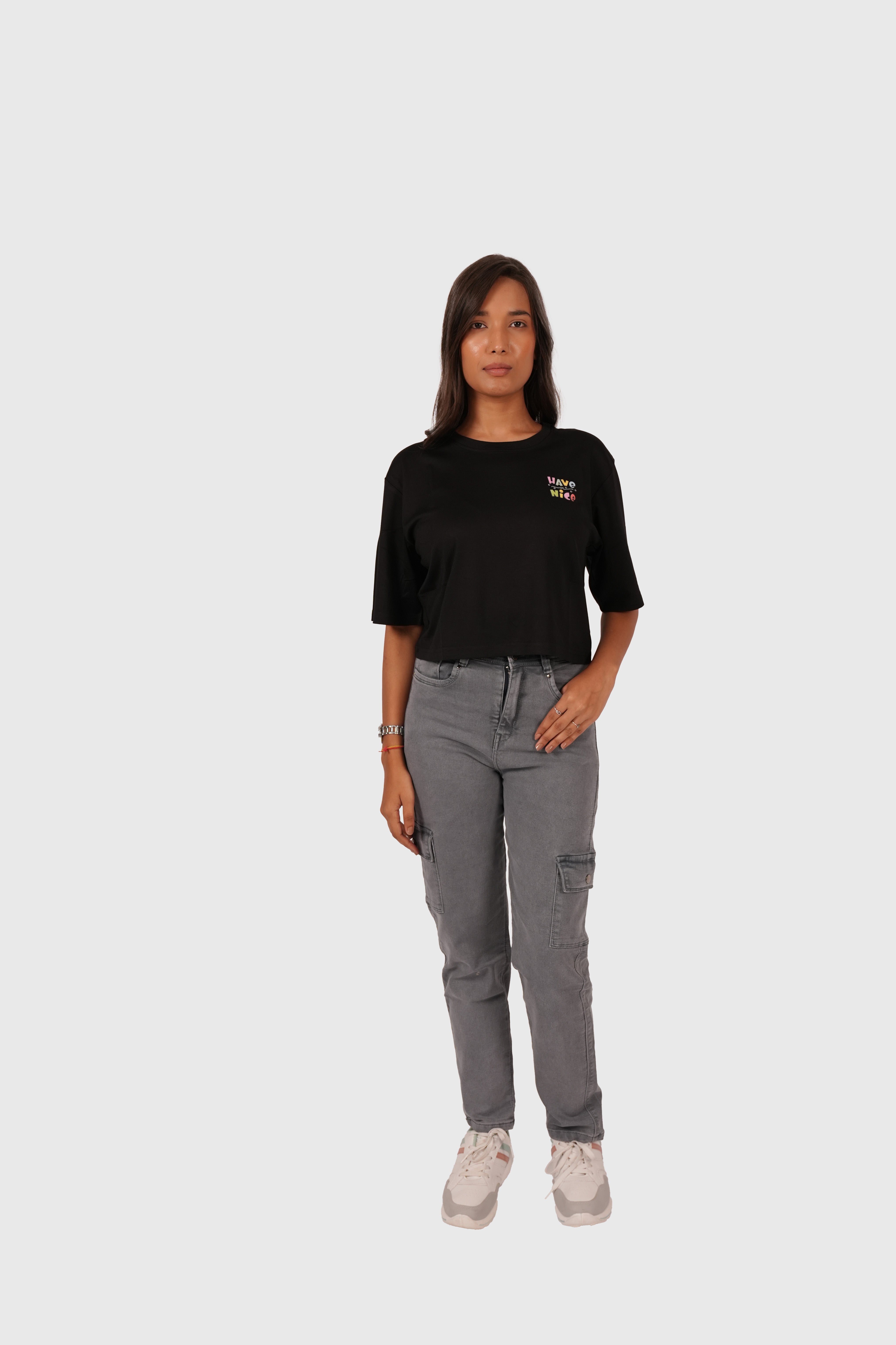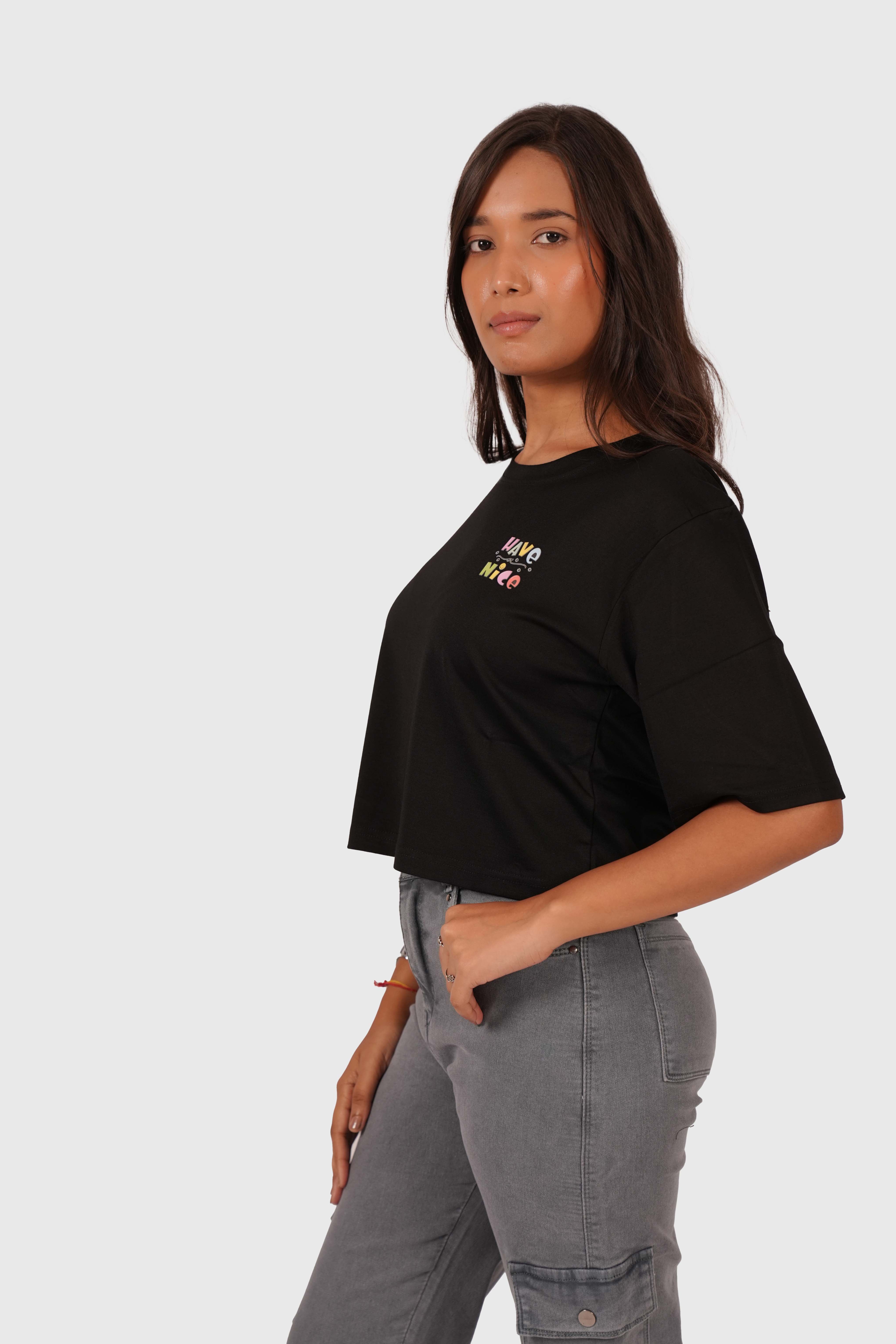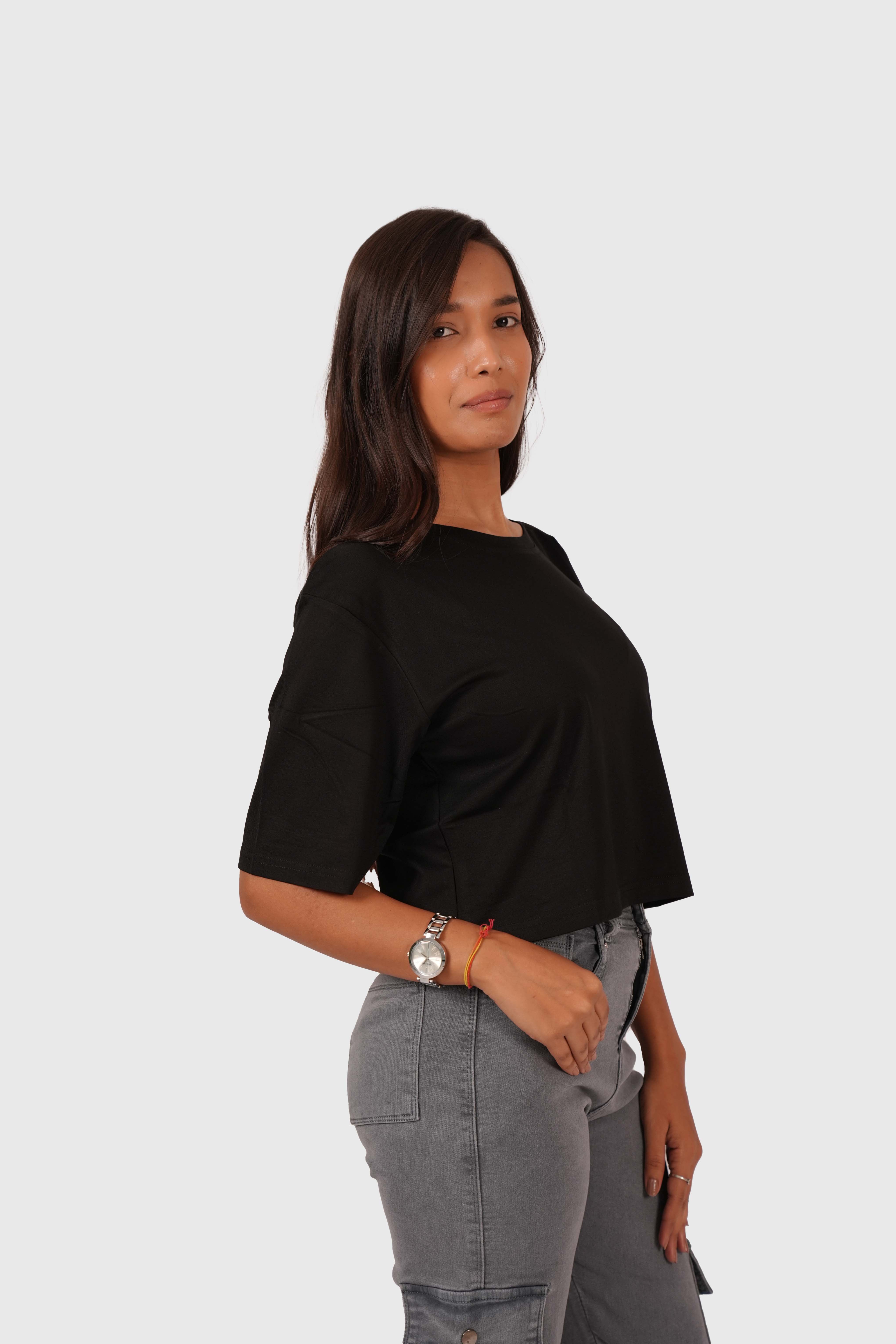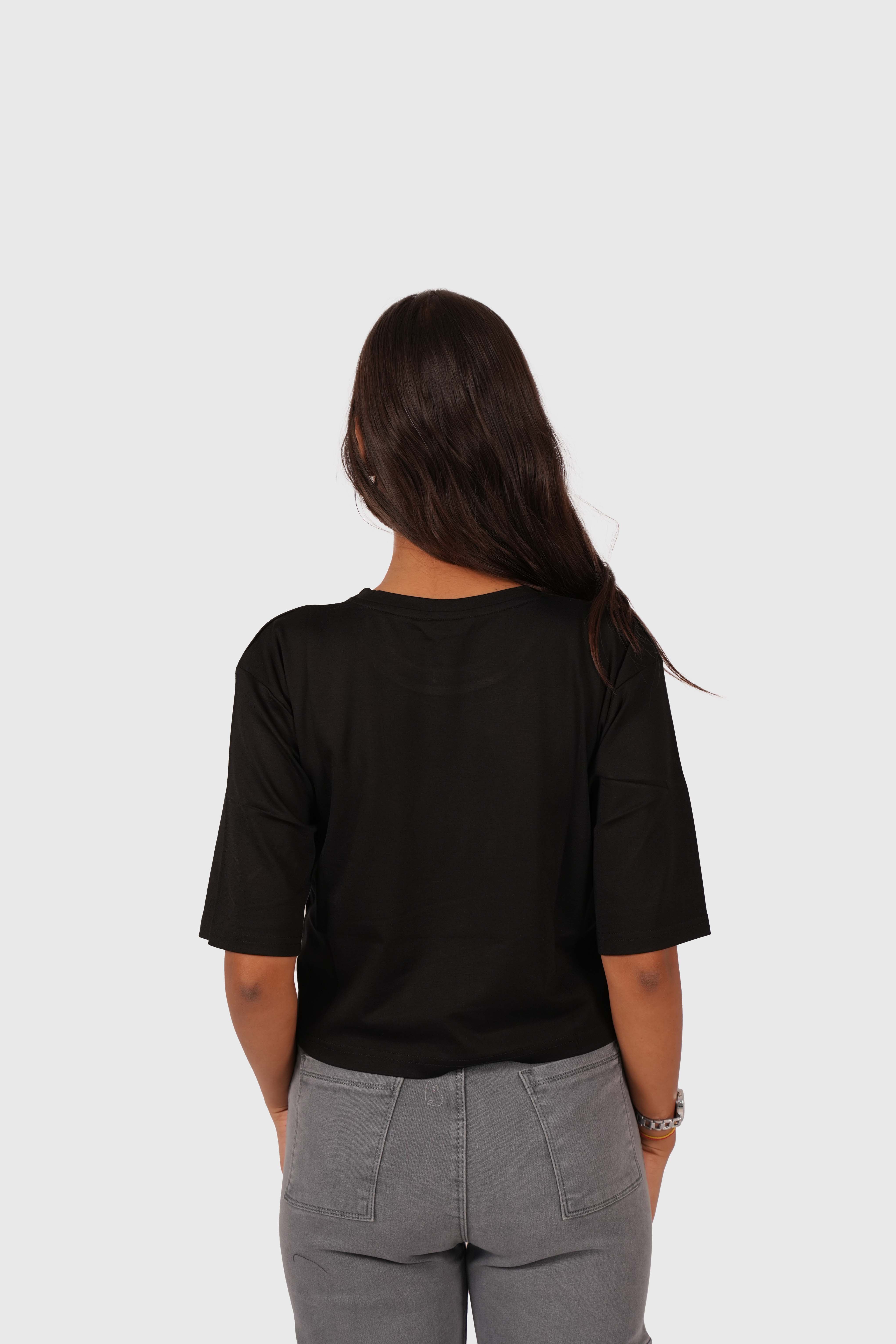 Black oversized crop T-shirt in stretch fabric, combining relaxed comfort with a bold minimalist streetwear look.