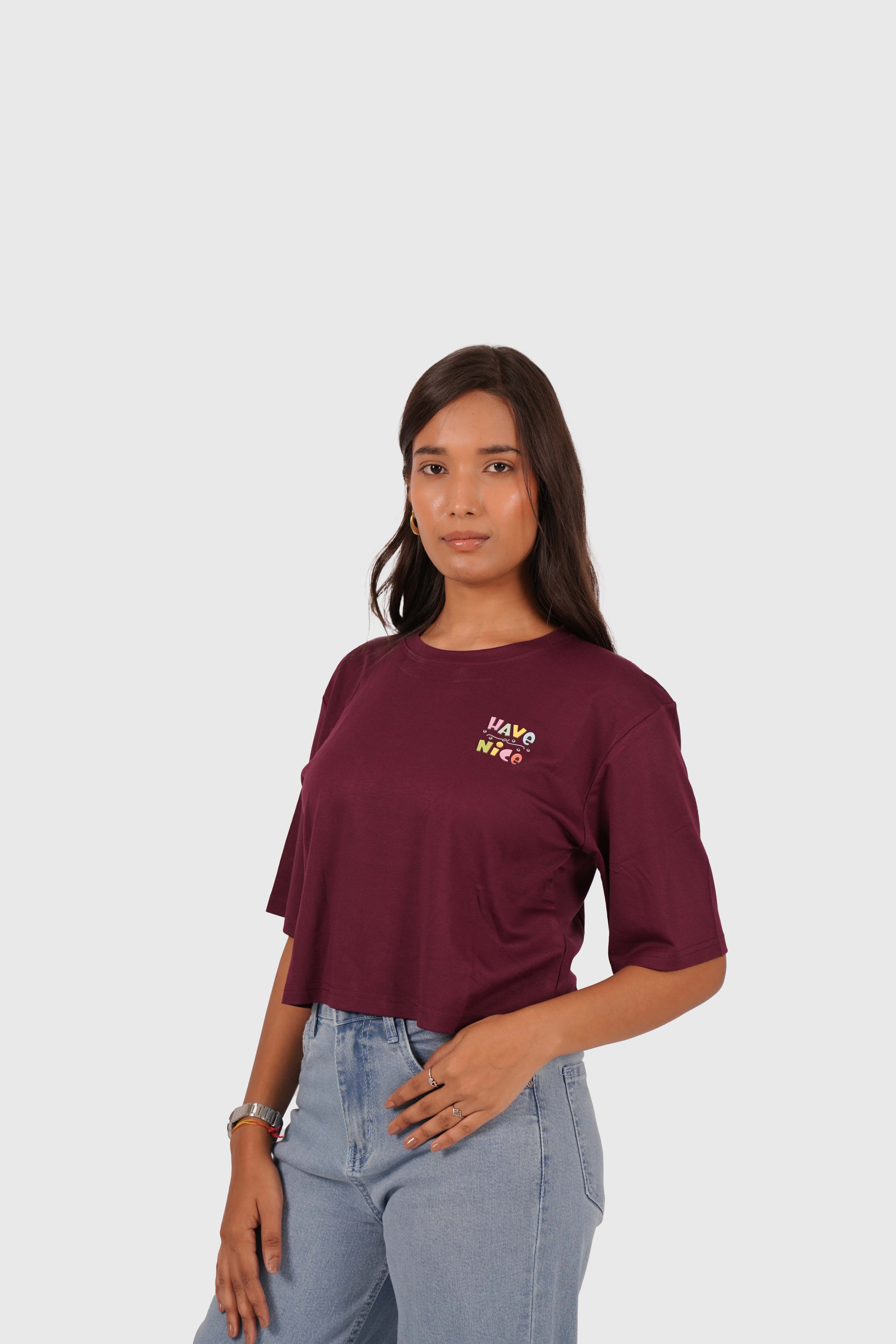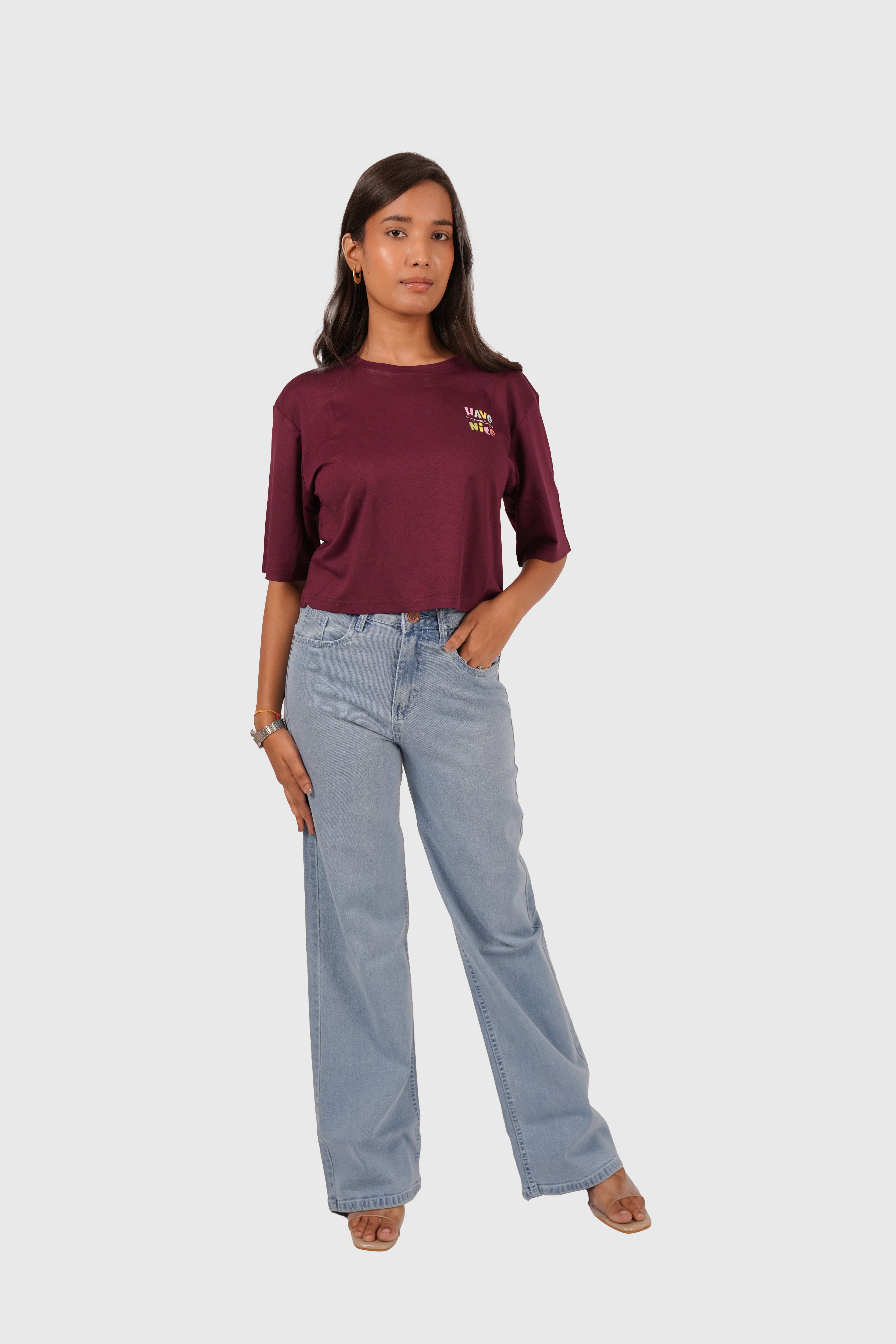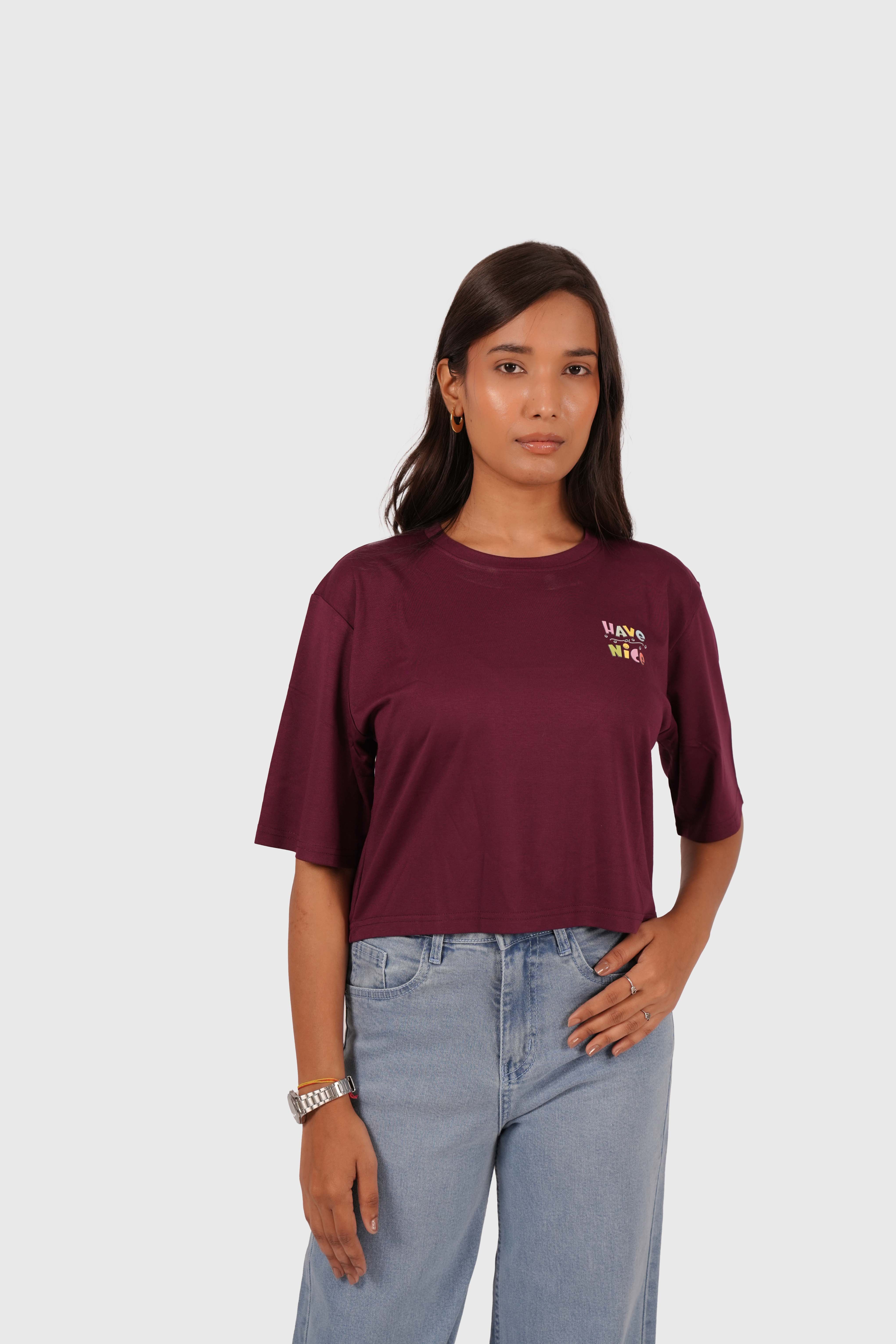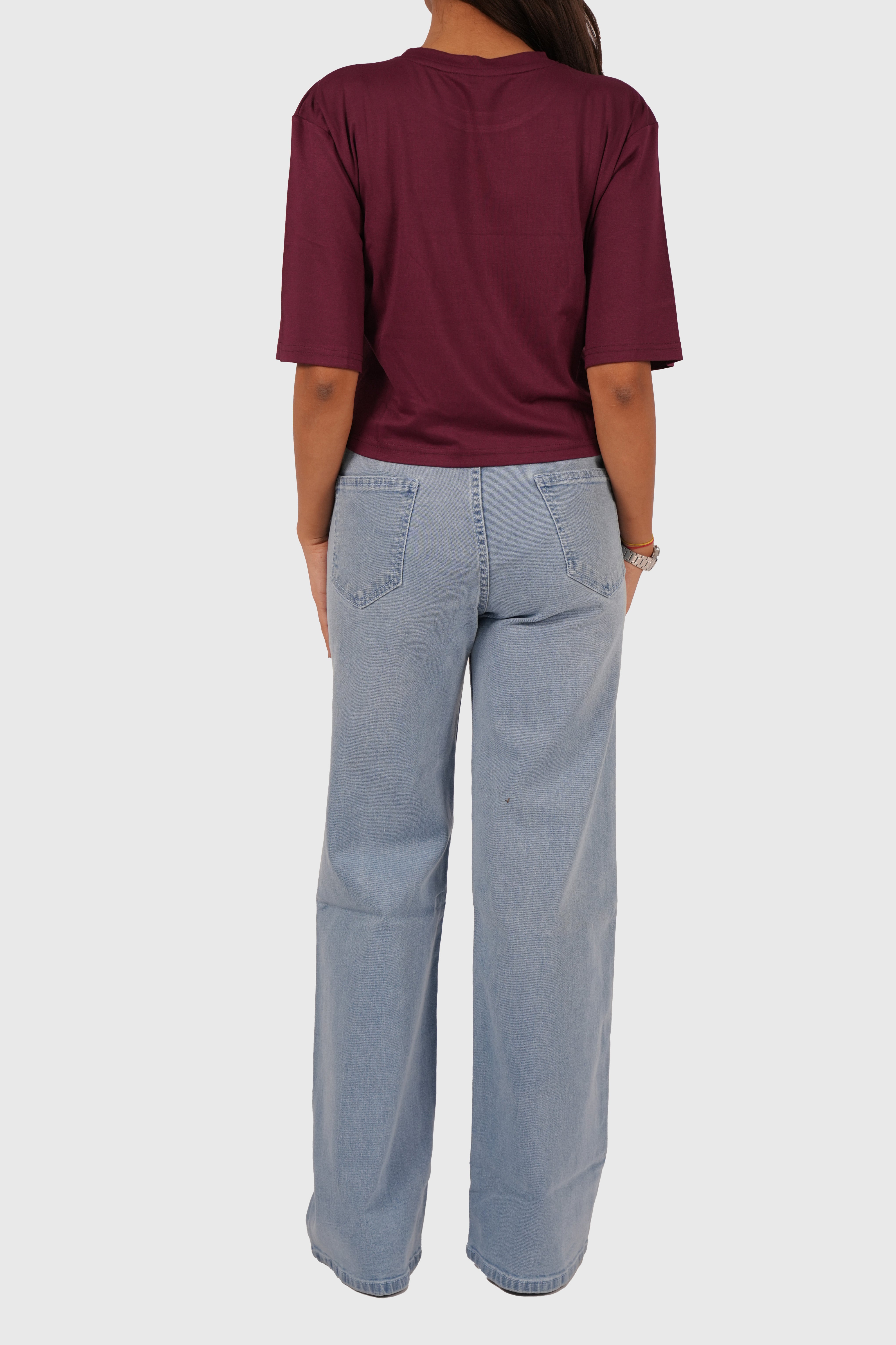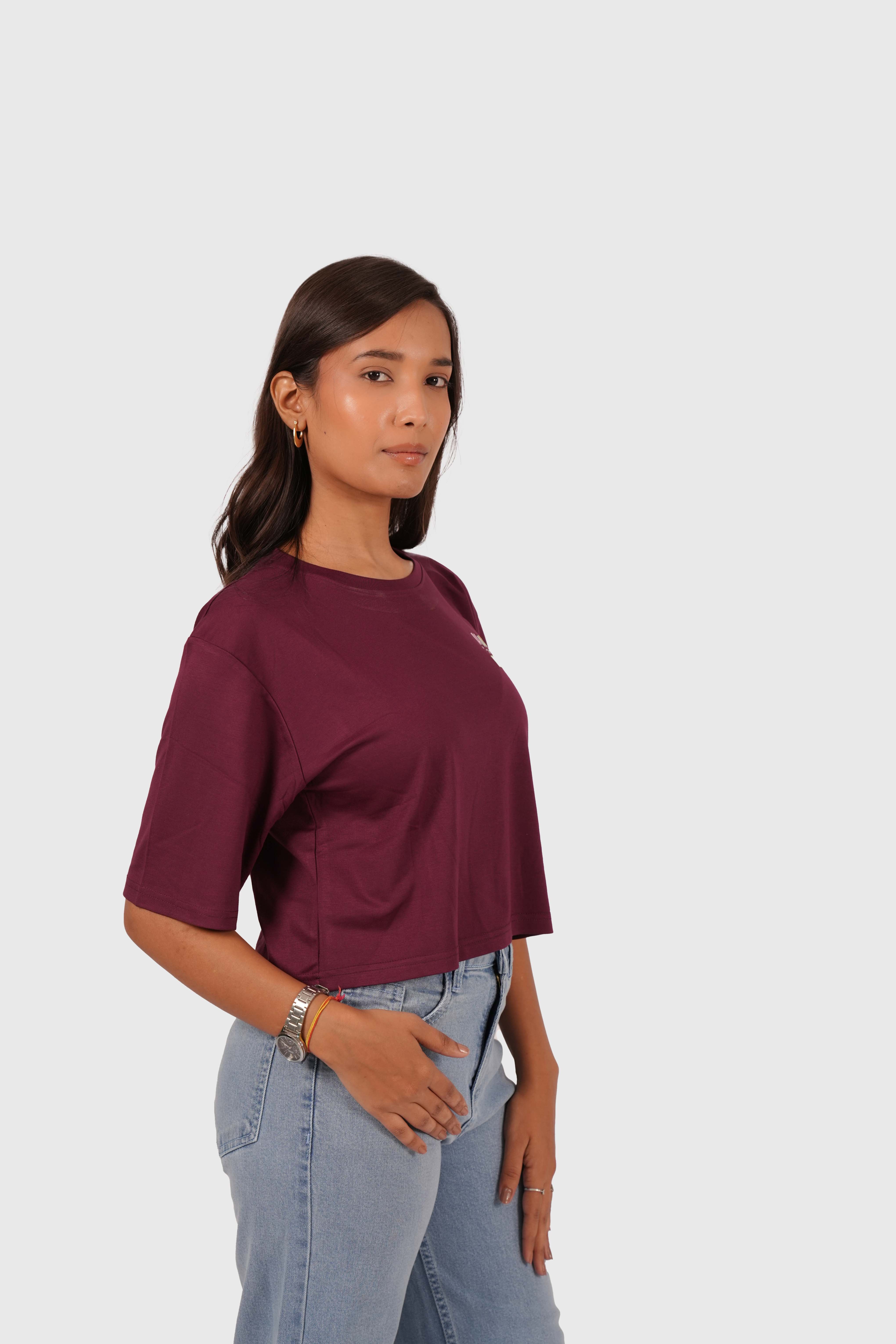 Crafted from imported stretchable fabric, this wine oversized crop T-shirt pairs relaxed streetwear style with a bold, fashion-forward color.